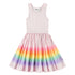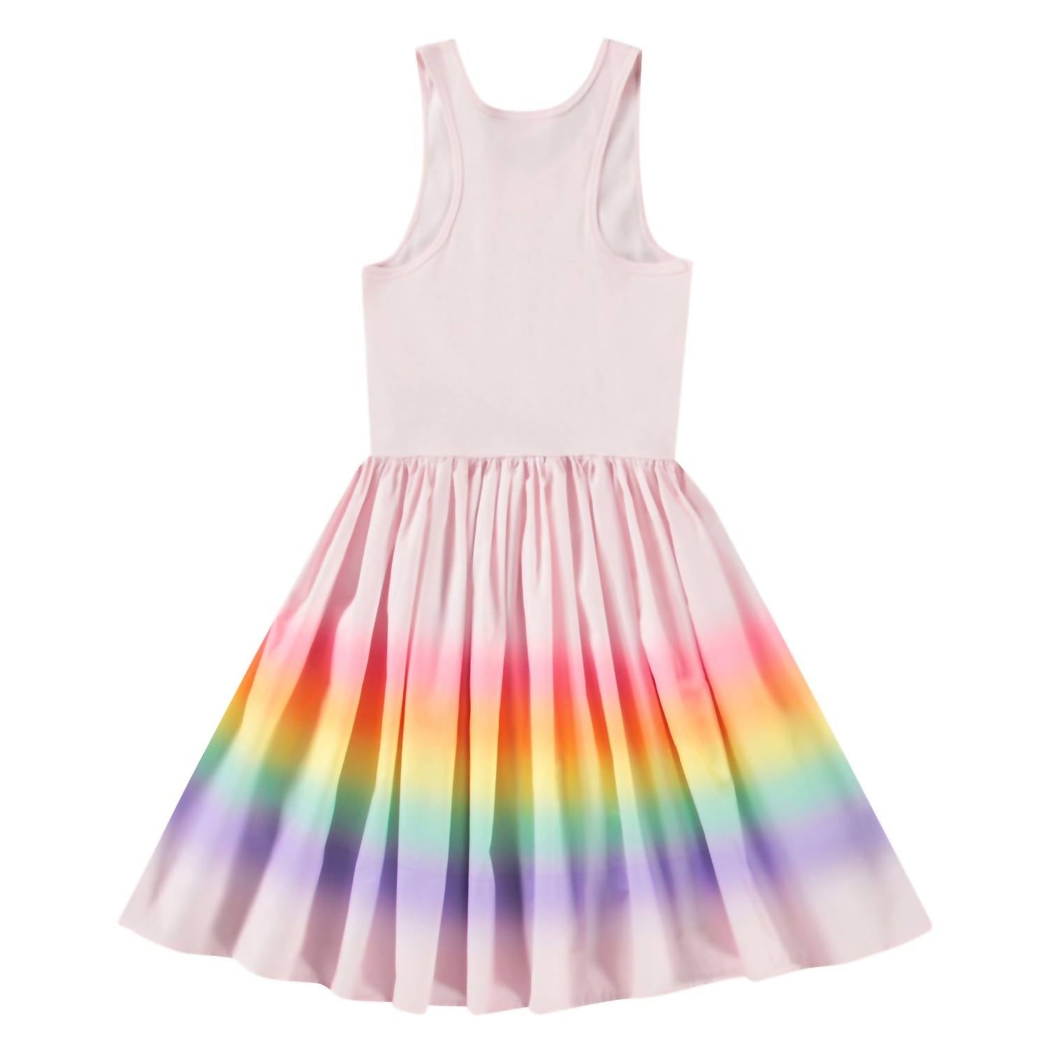Introducing the Girl's Cassandra Dress Fading Sunset by Molo, a charming piece crafted for casual spring occasions. This pink dress features a snug-fitted ribbed jersey top paired with a poplin skirt, adorned with a delightful rainbow print. Made from 100% organic cotton, it promises comfort and sustainability with its GOTS Organic certification by Ecocert Greenlife, License no. 197496. Care for this stripe-patterned dress is simple with machine wash instructions.