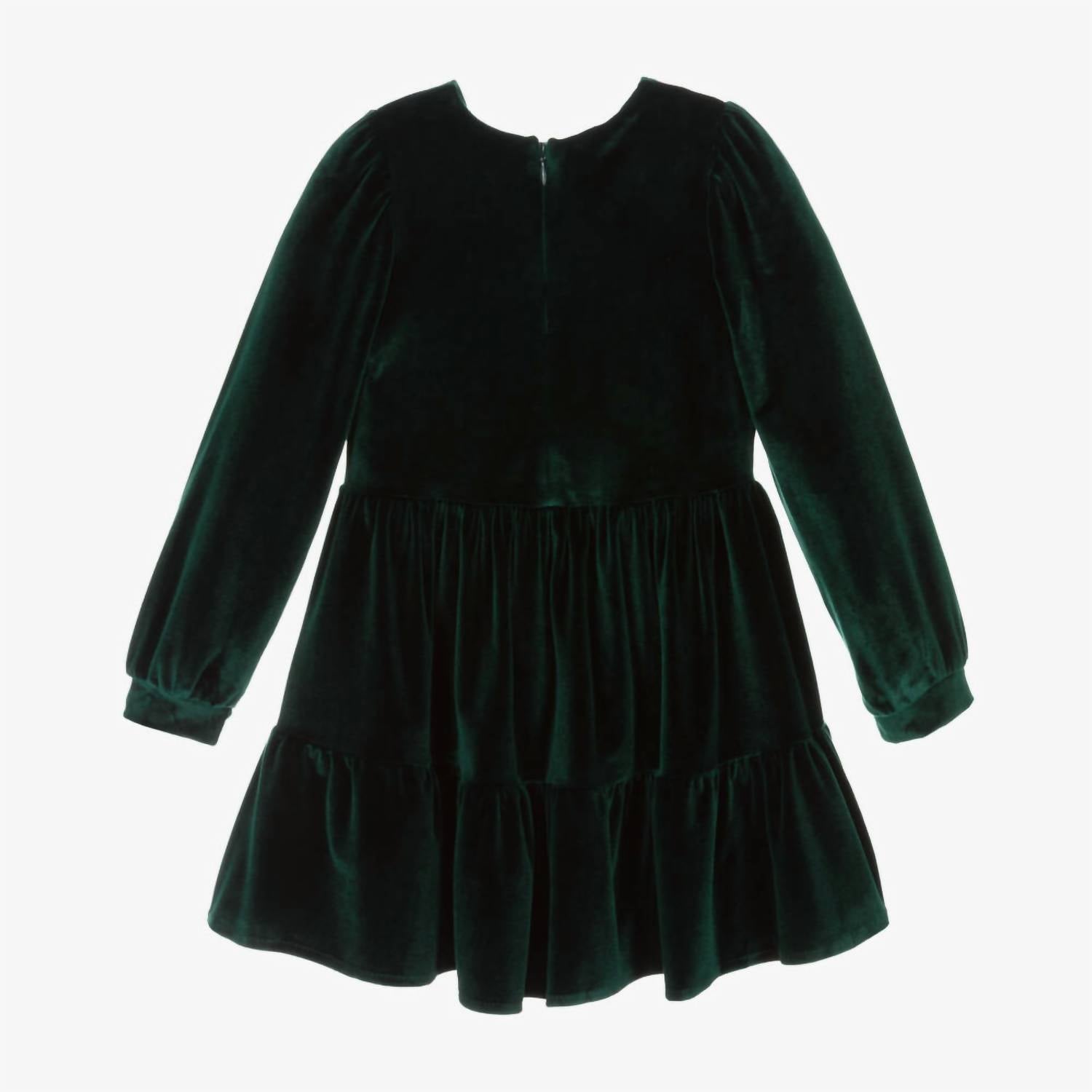 Elegant choice in a rich emerald green perfect for holiday parties. Features puffed sleeves and a deep frill around the hemline. Crafted from 94% polyester and 6% elastane, offering a soft, stretchy velour fabric. On-the-knee length and a discreet side zip closure for ease of wear. Care instructions include machine washing at 30°C, ensuring hassle-free maintenance for repeated wear.