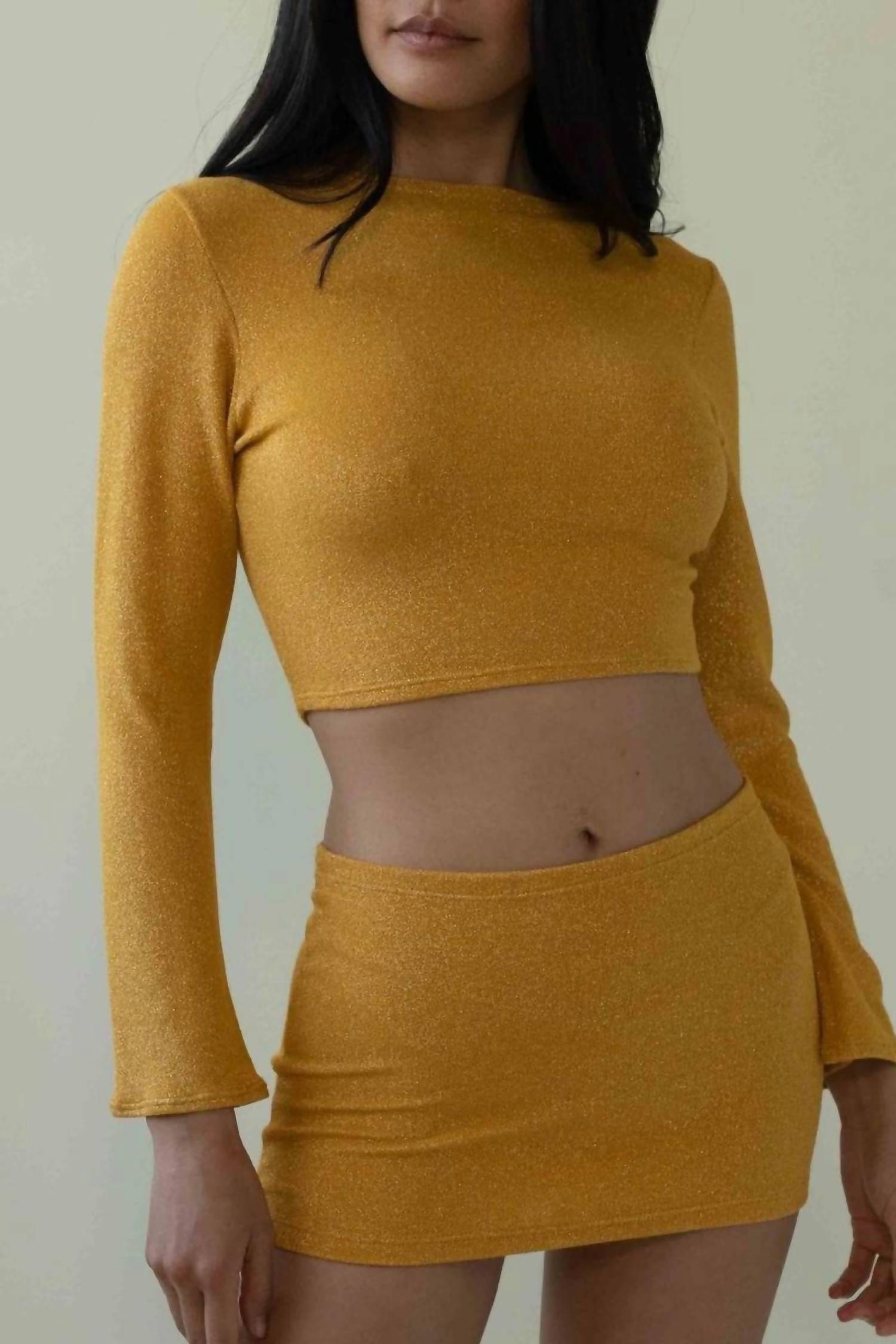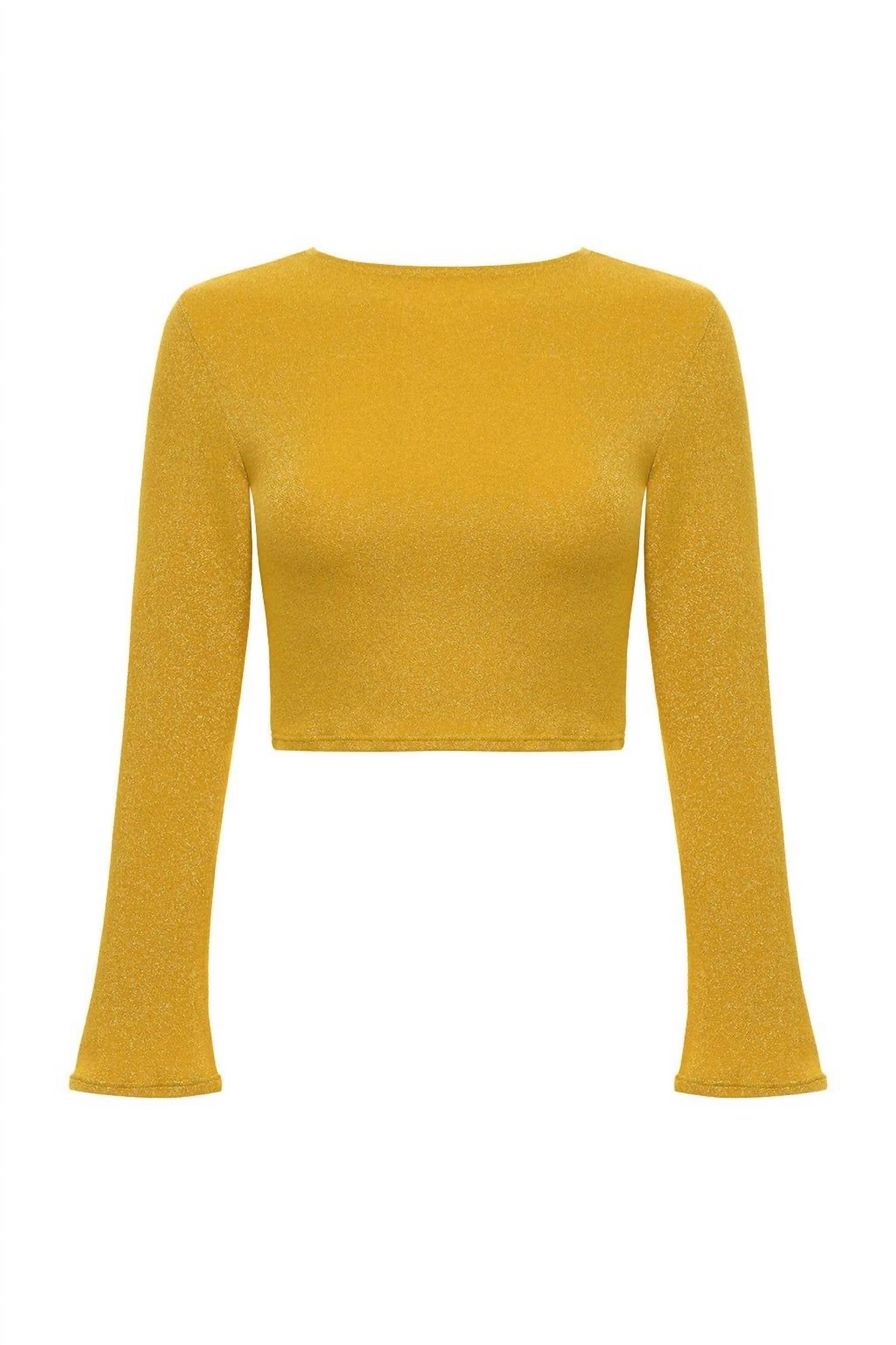Show a little skin in this cute and casual crop top. Elevate your wardrobe with the Montce Flair Solidad Top in Sun Sparkle, an eye-catching piece perfect for any spring occasion. This women's crop top features long flared sleeves and a flattering crew neckline, offering a slim fit with a stylish textured pattern. Crafted from a blend of 47% Viscose, 27% Polyester, 11% Metallic Fiber, 11% Nylon, and 4% Spandex, the top is designed for comfort and flexibility. Closure: Pull-on. Care: Hand wash with care due to the delicate nature of the fabric.