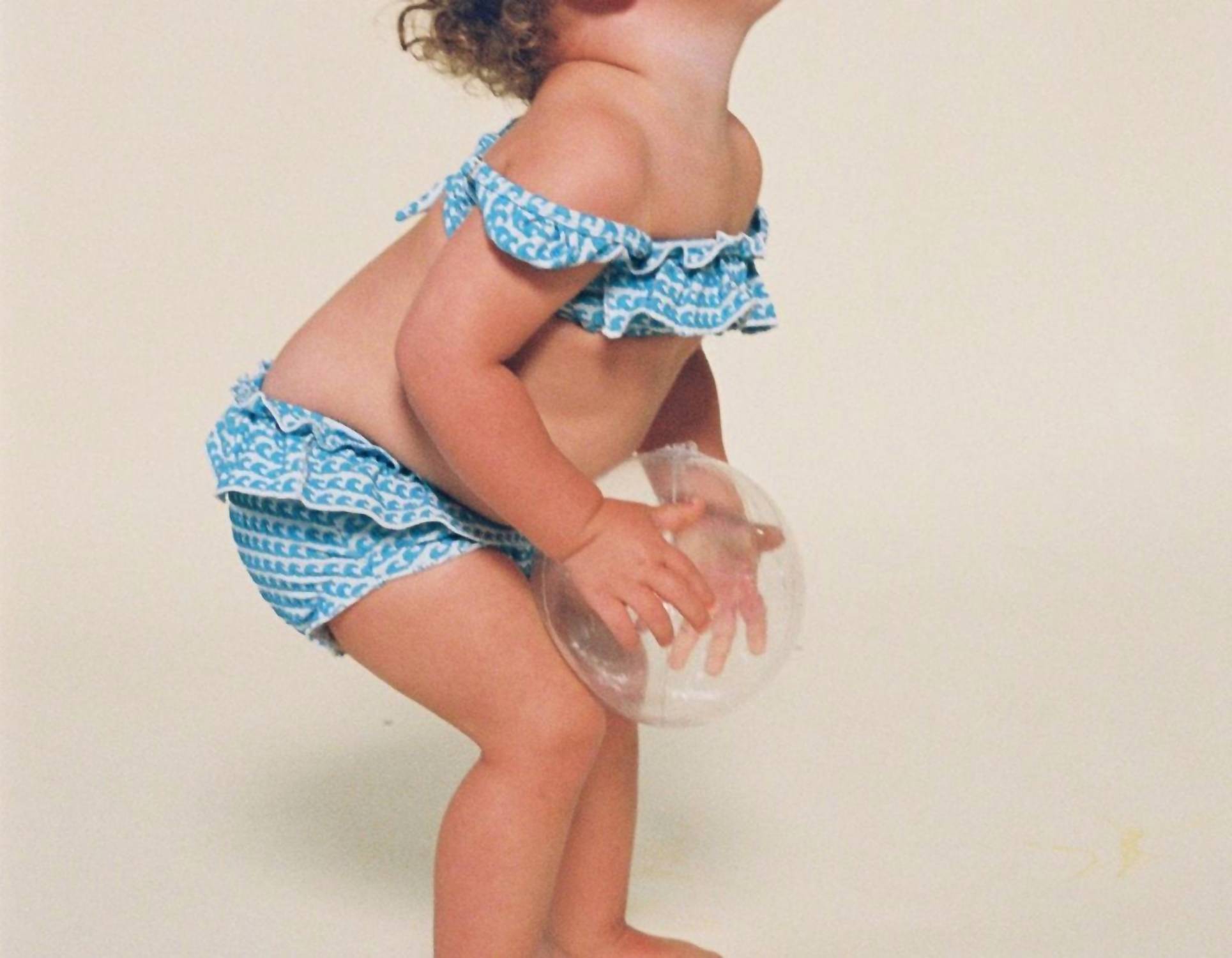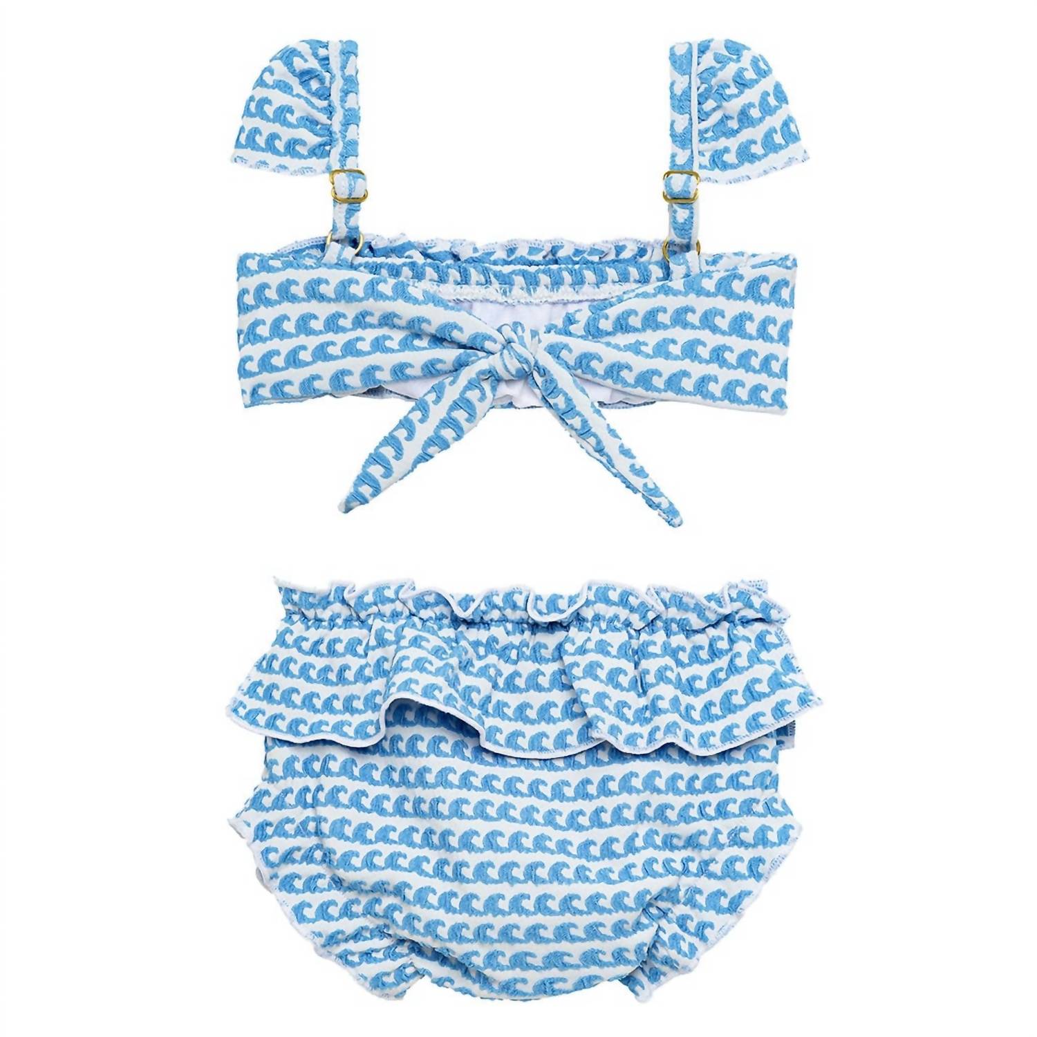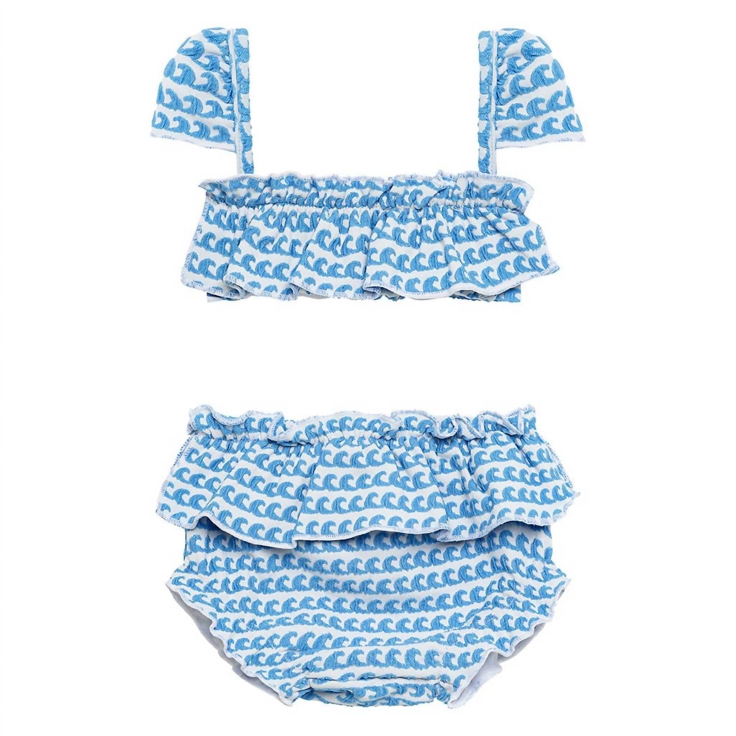 Dress your little one in style with Montce's Girl's Mini Cabana Bikini Set in the vibrant Wave Repeat pattern. This chic swim set features charming ruffle detailing on both the cap sleeve bandeau top and the mini ruffle skirted bottoms, perfectly designed for diaper-wearing children. Crafted for comfort, the top offers adjustable straps and a tie-back closure, ensuring a secure fit. Care for this adorable boho chic set with a gentle hand wash, making it perfect for Summer beach days and 4th of July celebrations.