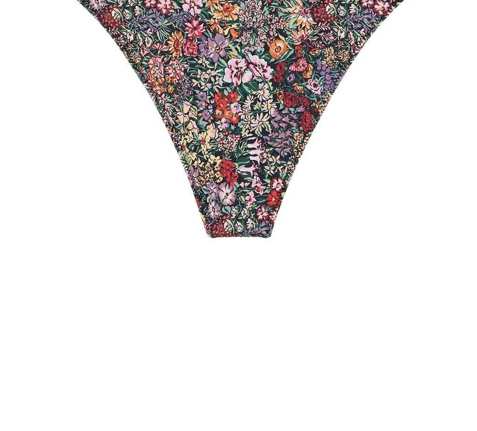 Introducing the Lulu Zig-zag Stitch Bikini Bottom by Montce, a chic swim essential in the vibrant Mara Floral print. Crafted from a soft Lycra nylon/spandex blend, this bikini bottom showcases a high cut style that elongates the leg. With its retro silhouette, it offers moderate coverage and a medium low rise, accentuated by a trendy zig zag stitch at the seam. Fabric is imported from England, and for care, simply hand wash to maintain its boho chic appeal. Perfect for a beach day during the summer, this cheeky bikini bottom is designed to flatter every figure.