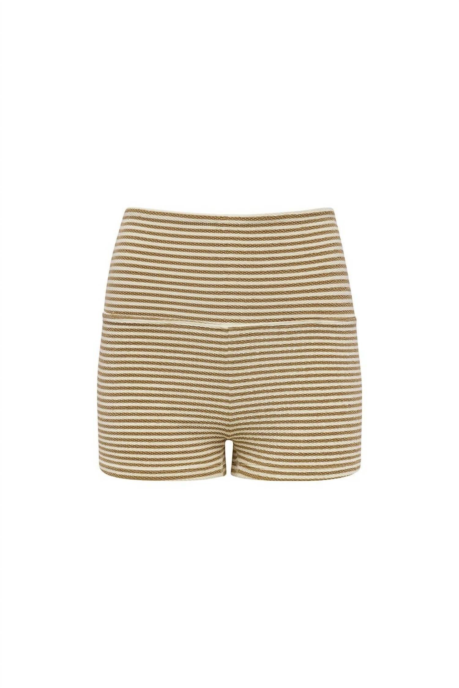 Discover the Montce Micro Bike Short, crafted in a stylish tan and beige striped pattern ideal for a minimalist summer look. With an approximate 2" inseam and a high-rise fit, this piece features light compression and a wide, contouring waistband for superb comfort. Made from a blend of 90% nylon and 10% spandex, this thick and textured fabric is imported from Spain and features OEKO-TEX certification. Closure: Pull on. Care: Machine wash and line dry. Make these versatile shorts your go-to for loungewear, light exercise, or as a chic swim bottom.
