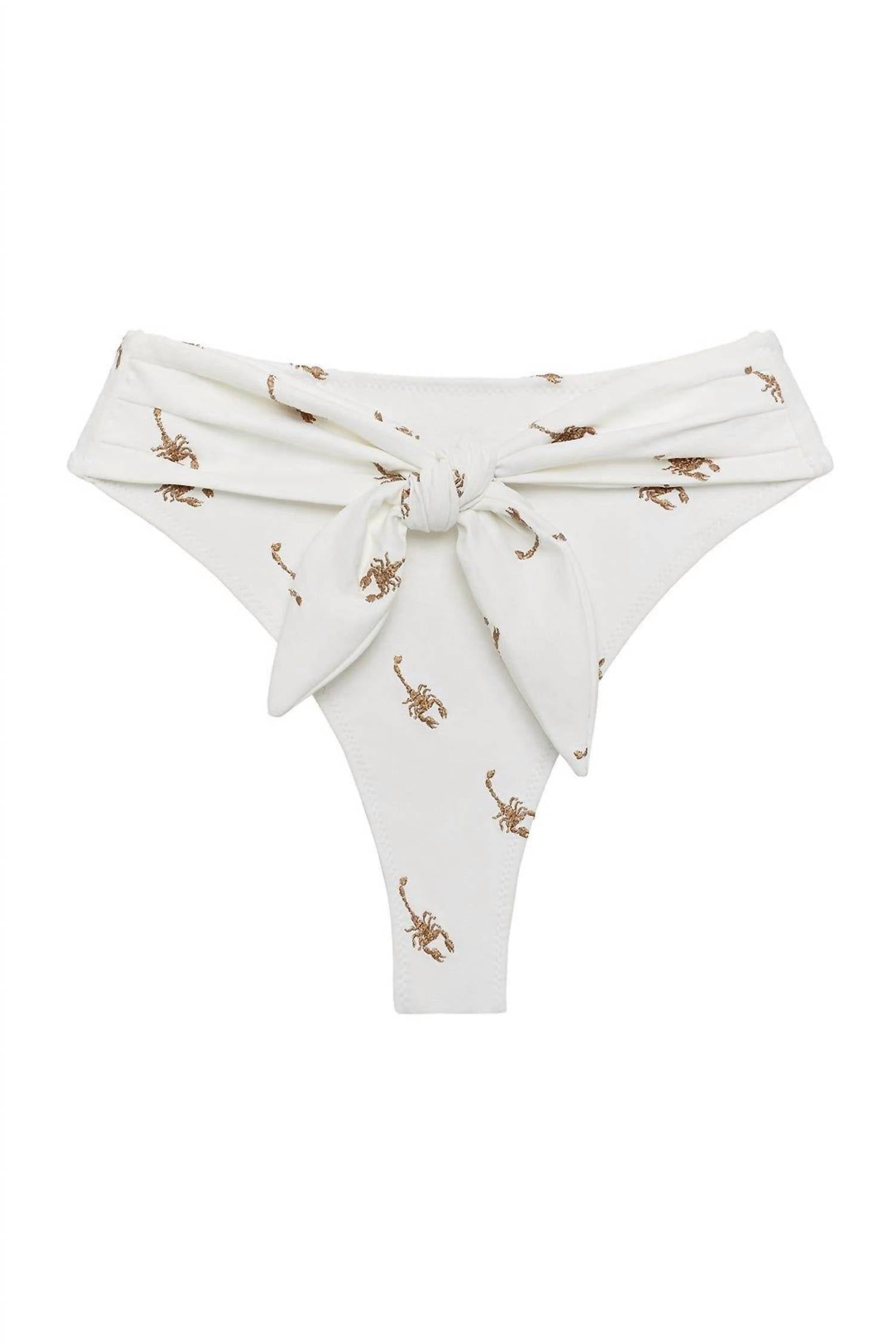 Elevate your beachwear with the Paula Tie-up Bikini Bottom by Montce, a stunning piece in a Scorpion colorway with a unique pattern. Designed with full front coverage and moderate back coverage, this high-waisted bikini bottom clinches at the waist with a ruched back to accentuate your curves. Constructed from 95% recycled nylon and 5% spandex, it features a delicate fabric that should be kept away from rough surfaces. Care instructions advise hand washing and line drying to maintain its flawless condition.