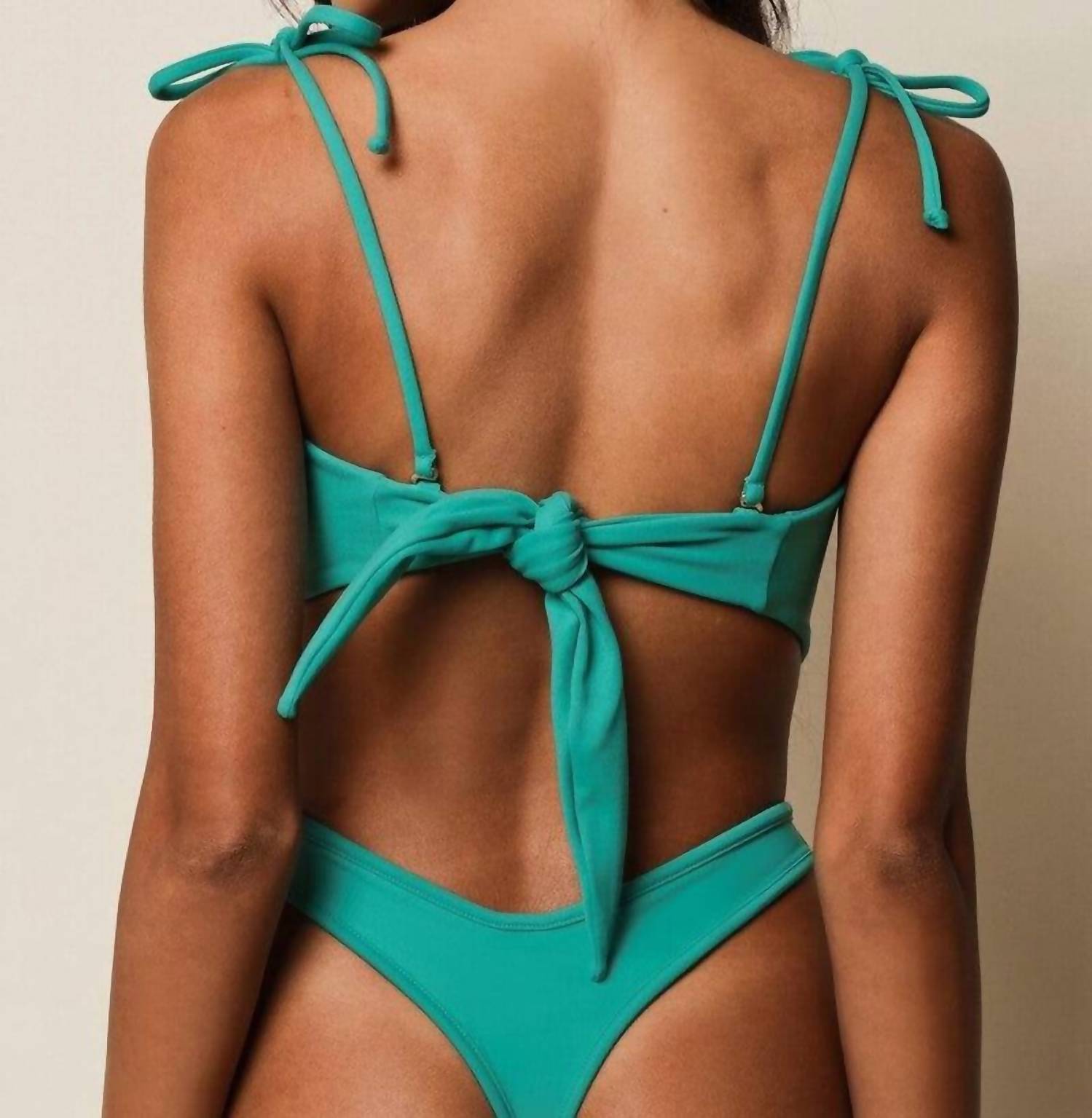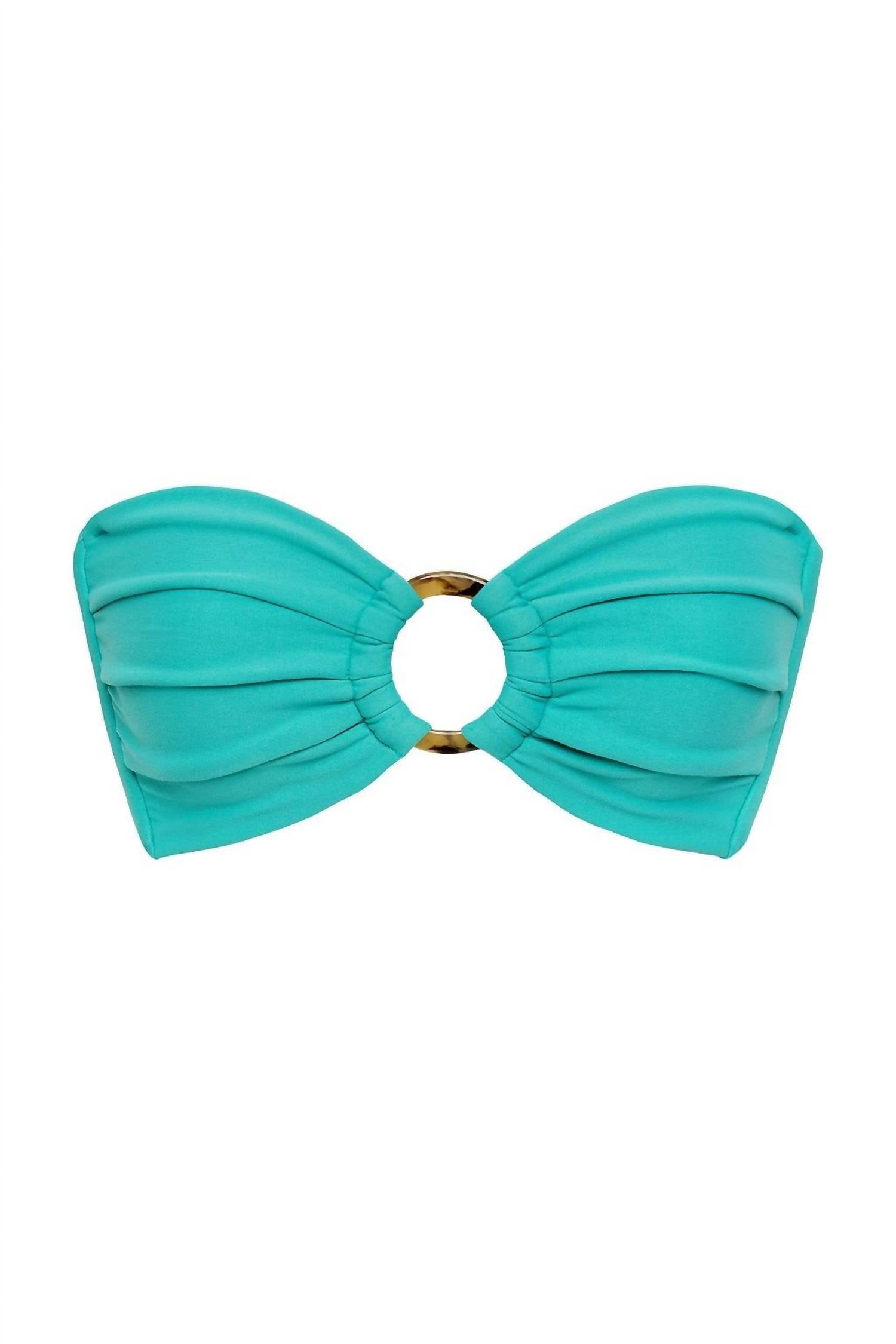 Dream of your next beach getaway in this cute little number. Pair with strappy sandals, a floppy hat, and an oversized tote to complete the perfect vacation look. Elevate your beach day look with the Montce Tori Ties Bandeau Bikini Top in Teal. This strapless swim top is crafted from a nylon blend with 90% Supplex FD and 10% Extra Life Nylon, offering medium support with side-seam boning. Its adjustable self-tie back ensures a tailored fit and comfort, complemented by a flattering sweetheart neckline and ruched detailing. Featuring UV protection UPF 50+ and OEKO-TEX certification for added peace of mind, this solid bandeau silhouette is a minimalist's summer must-have. Care: Hand wash and line dry.