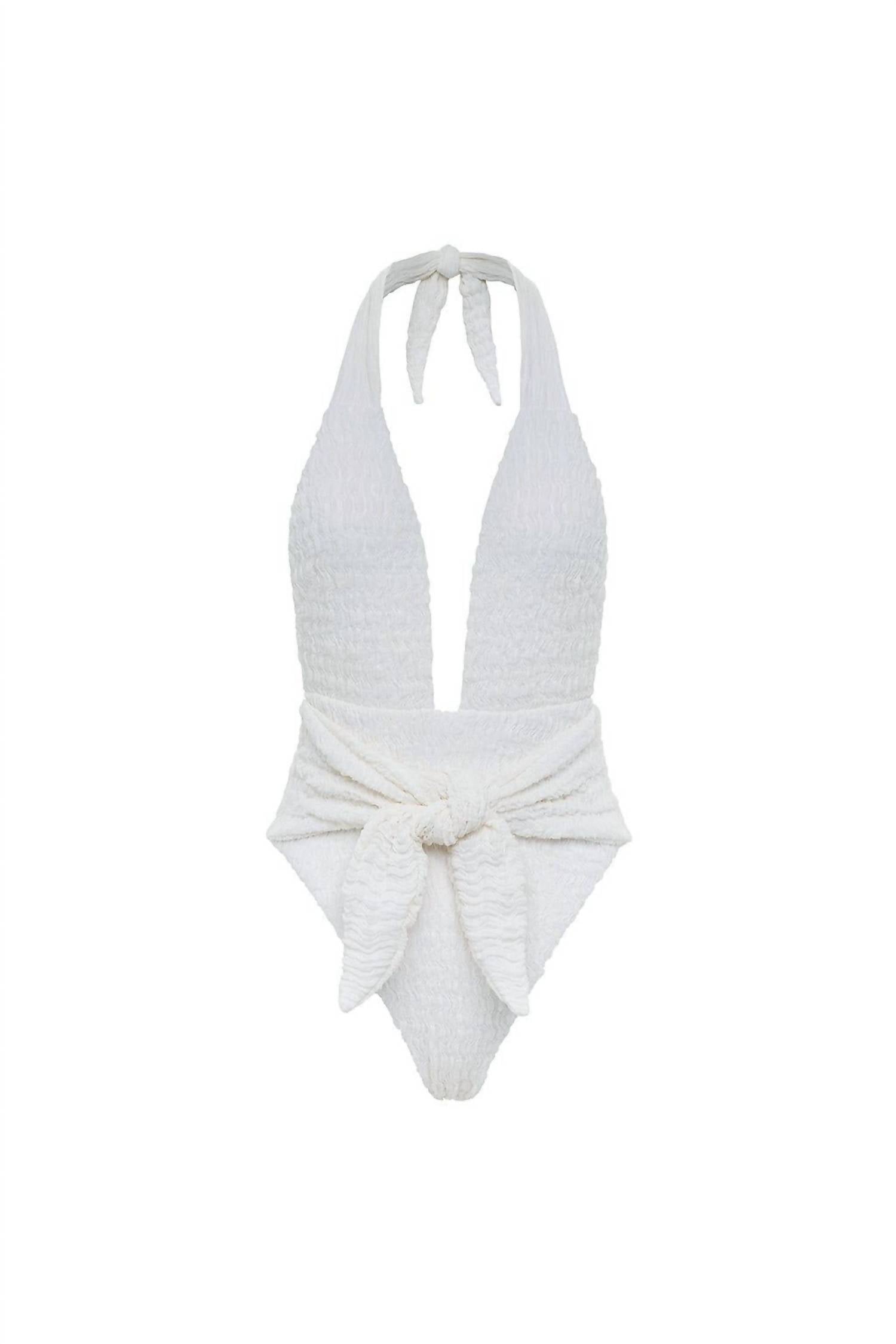 A one piece so chic you could even wear it as a bodysuit with your favorite pair of jeans. Introducing the Tropez Tie-up One-piece Swimsuit by Montce in the stunning Seychelles hue, tailored for style and comfort on a summer beach day. This minimalist one-piece features thick tie-up straps and a high cut for a leg-lengthening effect, alongside a deep plunging neckline and an open back with an oversized self-tie bow at the waist. Crafted from a delicate cotton blend with 55% Turkish cotton, 40% polyester, and 5% spandex, this piece is imported from Turkey and offers light support with moderate bottom coverage. Closure: Adjustable tie-up halter. Care: Hand wash, avoiding rough surfaces and harsh chemicals.