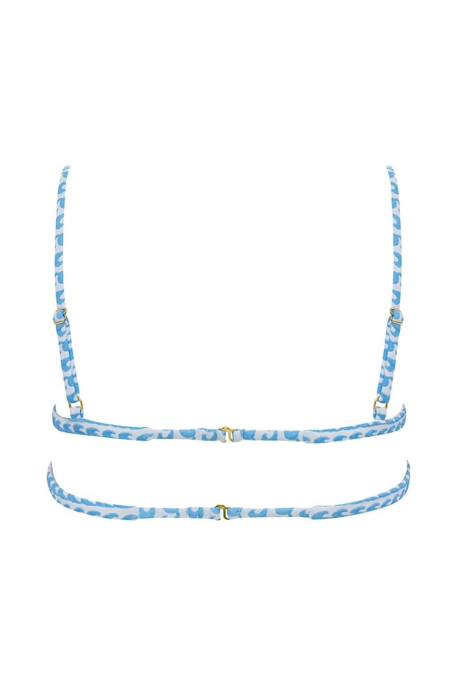 Elevate your beach day look with the Montce Underwire Elany Bikini Top in an eye-catching Wave Repeat pattern. This bikini top offers light support and features an underwire design with adjustable shoulder straps and a back hook closure for a customized fit. Crafted from 100% recycled plastic bottles, it is more delicate than other fabrics, so handle with care to maintain its quality. The bralette silhouette with a scoop neckline is enhanced by double back straps and gold tarnish-resistant metal hardware, adding style and support. Care instructions: Hand wash.