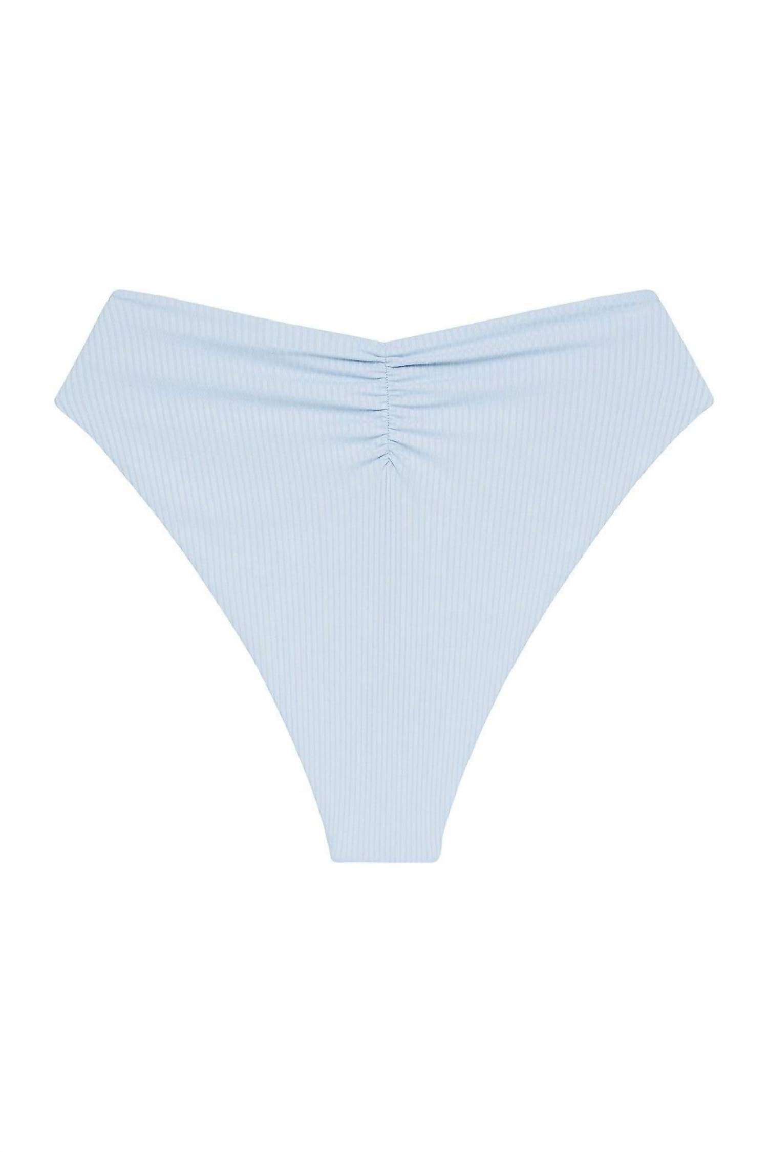 The Montce Women's Paula Tie-up Bikini Bottom in Peri Rib elevates beachwear with its delicate ruched back and high-leg French cut designed to elongate your legs. Crafted from a buttery soft, ribbed nylon and spandex blend imported from Brazil, this high-waisted swim bottom cinches in at the waist to create a flattering hourglass shape. With an oversized self-tie bow and solid periwinkle blue hue, this top-seller offers moderate back coverage and full front coverage, making it a stunning choice for your summer wardrobe. Care instructions: hand wash and line dry for the best maintenance.