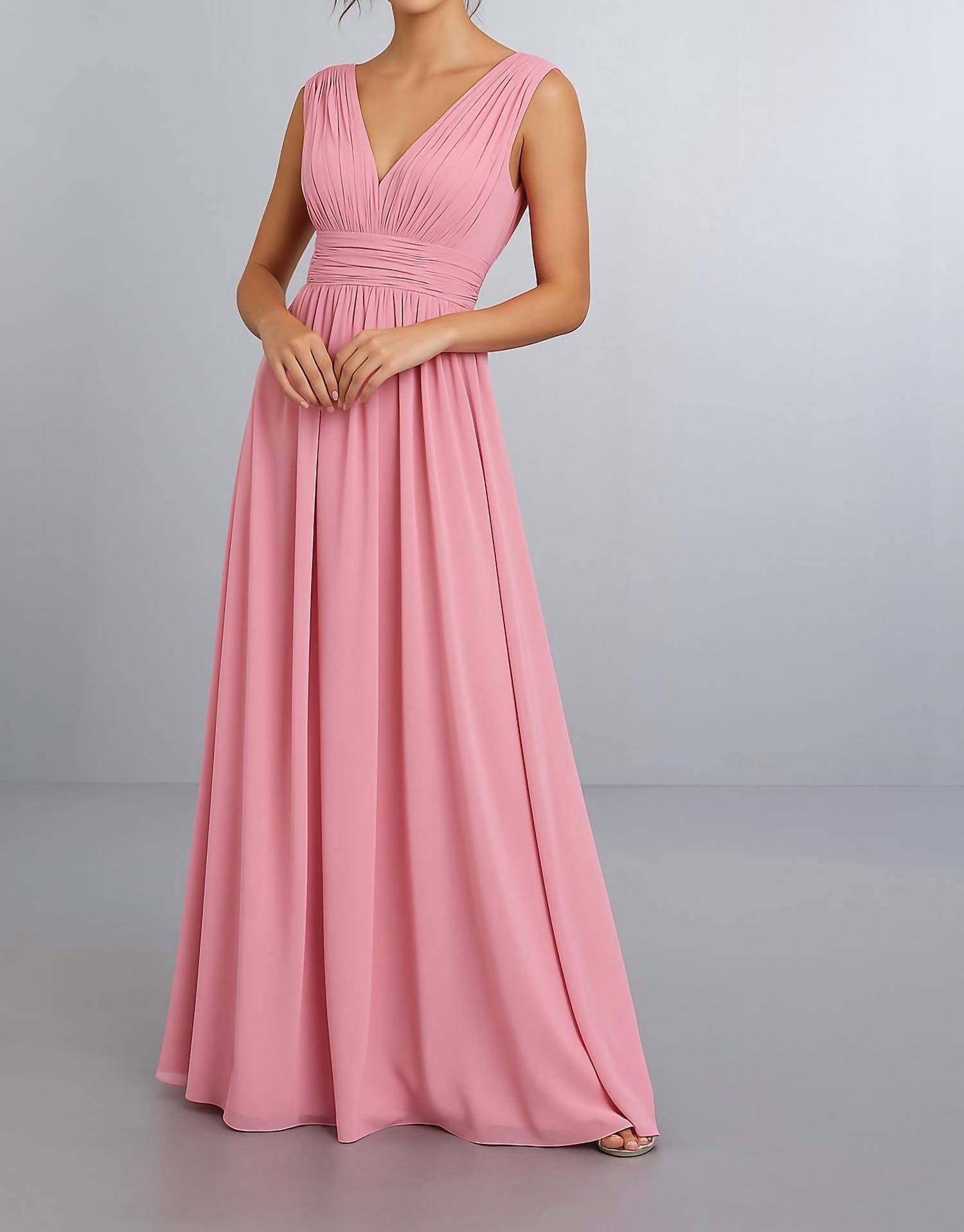 This chiffon A-line gown features a draped waistline, V-neck front and back, zipper closure, and a back neck tie.