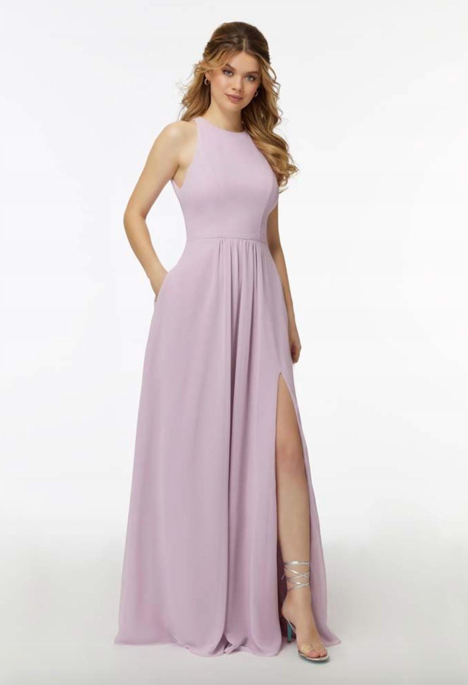 A high neck, halter Chiffon bridesmaid dress featuring a front skirt slit and open keyhole back, with a cowl and tie detail. Sku: 21726