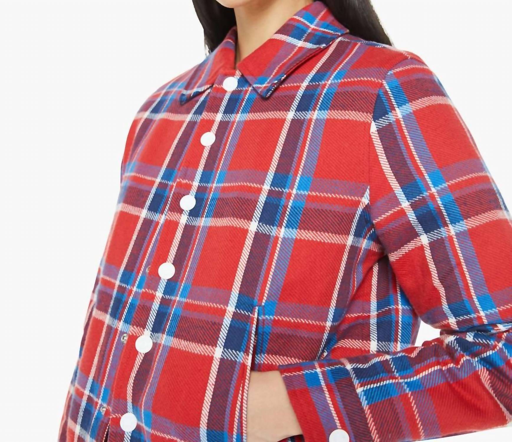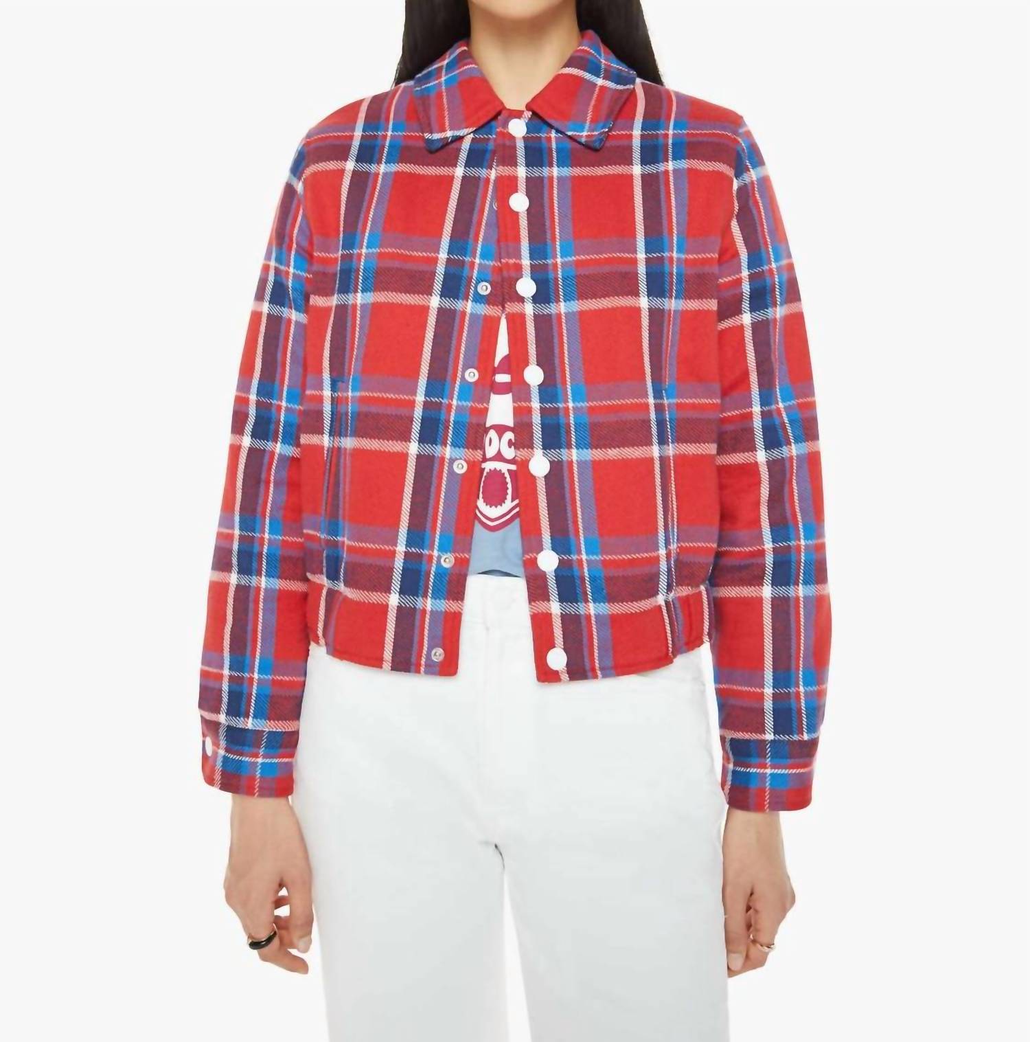 A casual yet cool jacket that every closset needs. Embrace a playful retro vibe with The Happy Camper jacket by Mother, designed for the modern woman. This casual long sleeve jacket features a nostalgic gingham print in red, white, and blue, with a collared neckline adding a classic touch. Crafted from 100% cotton, it boasts a cropped, boxy fit complemented by a button closure and elastic hem for comfort and style. Care is a breeze with machine wash instructions, ensuring this piece remains a wardrobe favorite for your adventurous outings.