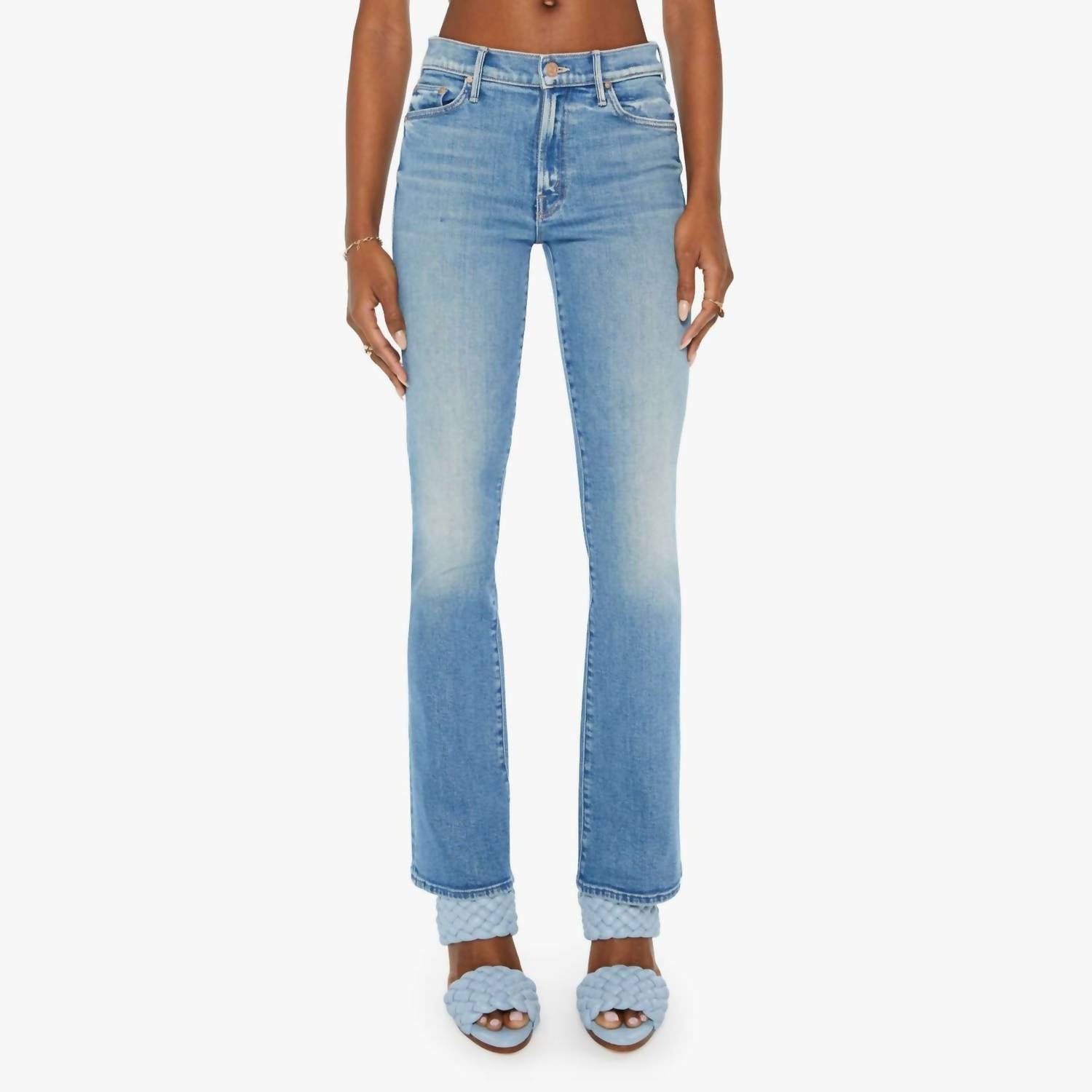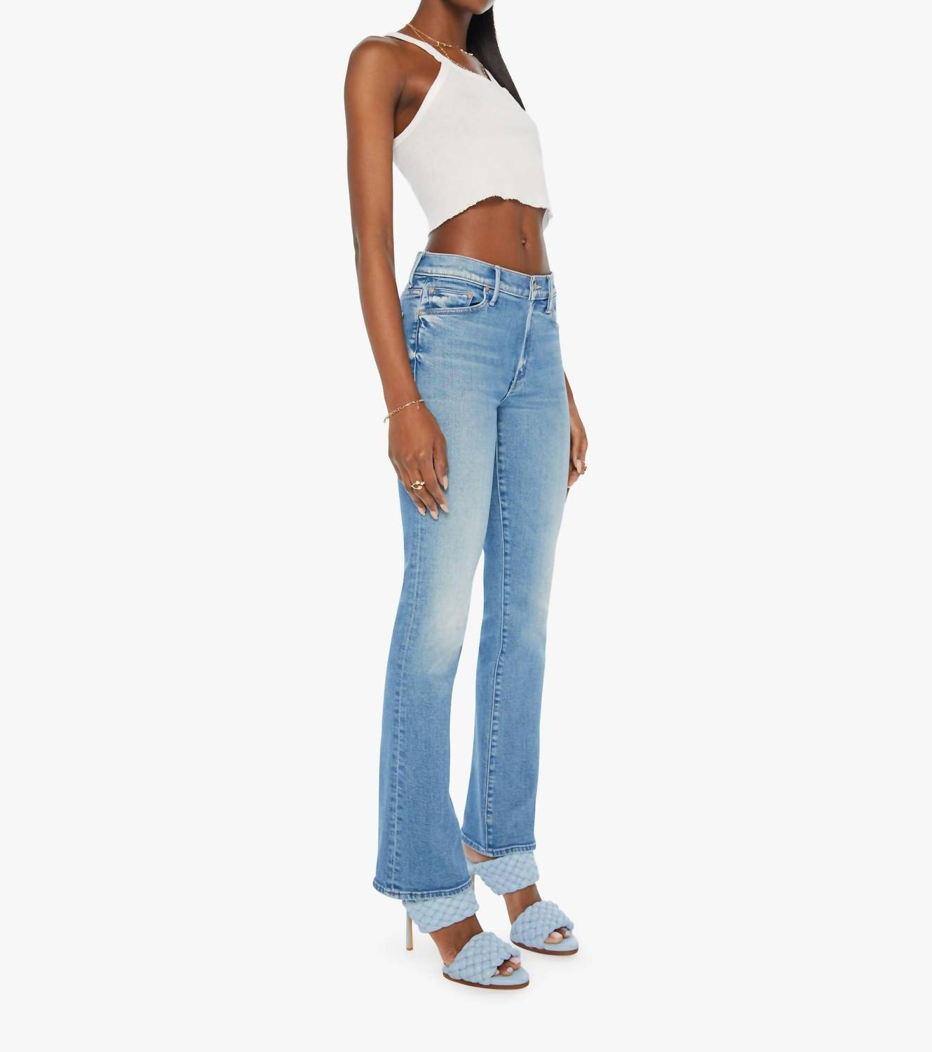 A boot-cut jean that not only looks good on, you'll be comfortable in them all day. Discover the Outsider Sneak Denim Jean by Mother, crafted for minimalistic style in the light-blue Flag Me Down wash. Featuring a mid-rise waist and a bootcut leg with a long 32-inch inseam, these jeans boast a clean hem and subtle whiskering and fading at the knees. Composition: 90% Cotton, 6% Post Consumer Recycled Cotton, 3% Polyester, 1% Elastane Blend. Made in the USA with a button closure. Care: Machine wash and tumble dry. Ideal for spring occasions like a 4th of July holiday party.