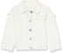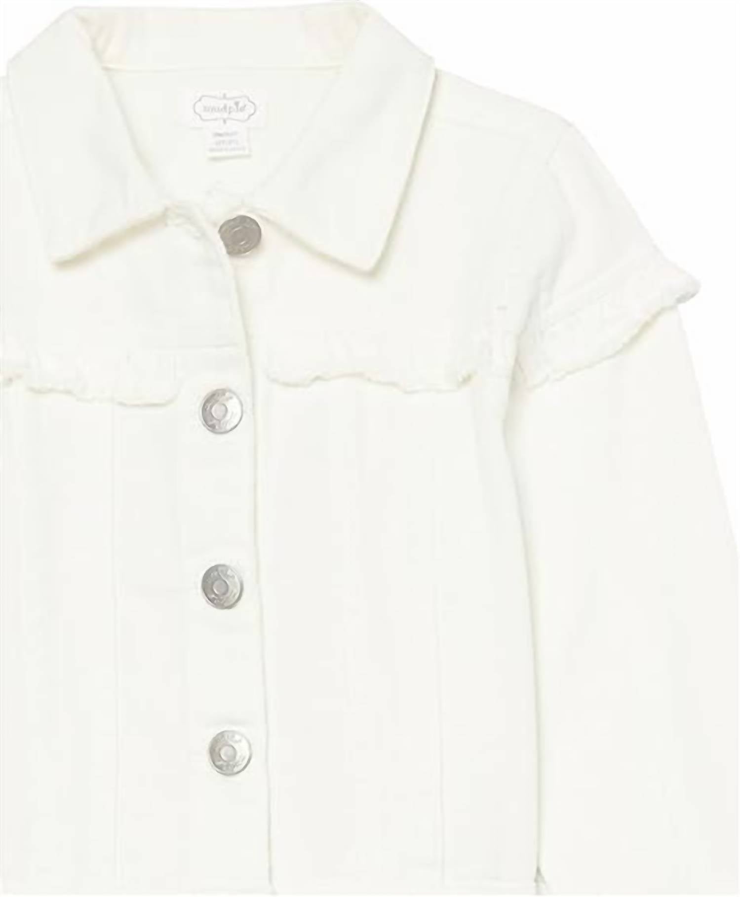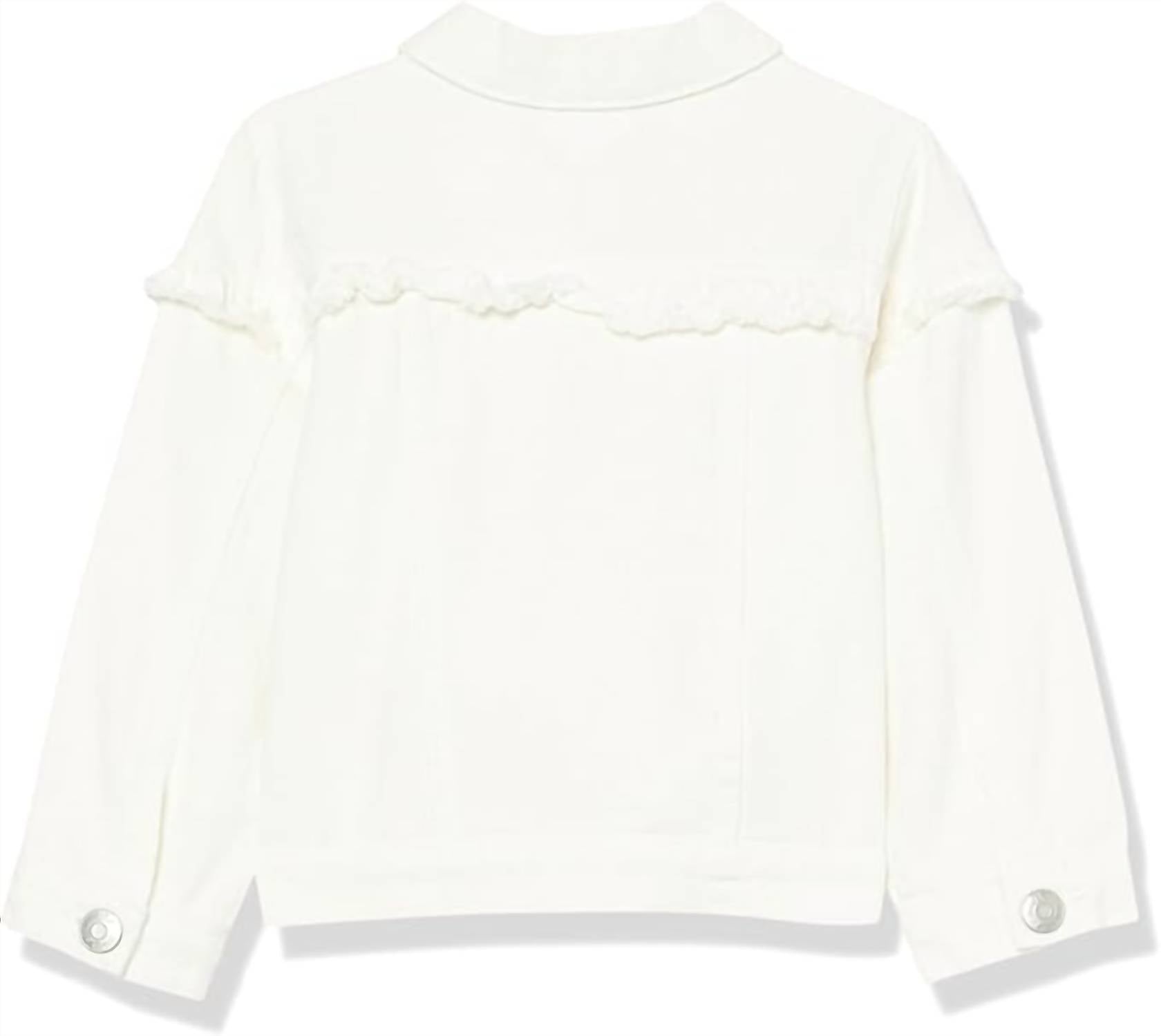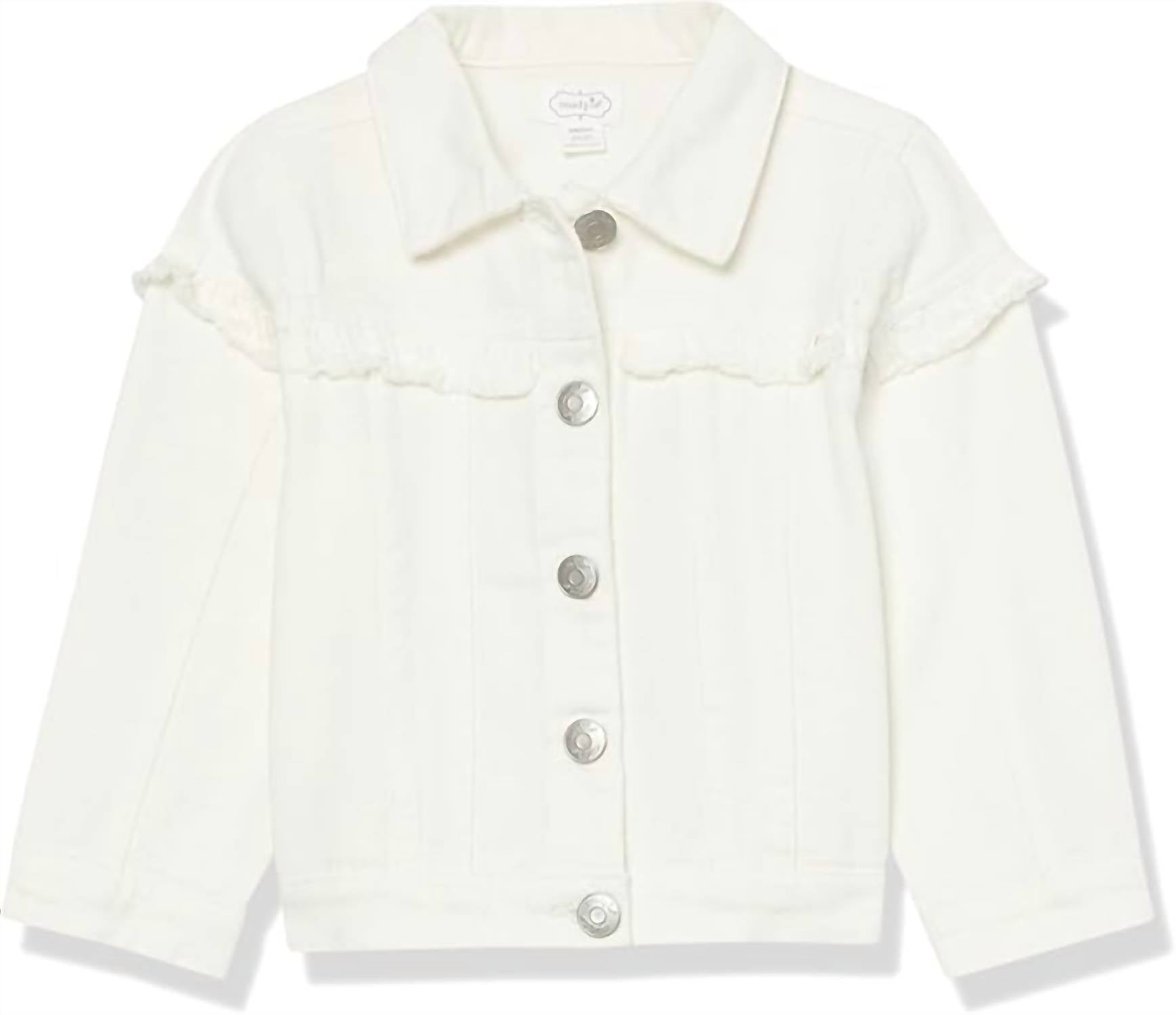 Dress up your little one in sweet style with our White Toddler Denim Jacket. This denim jacket features a charming Mud Pie button placket and an adorable chest ruffle. To keep it looking its best, turn it inside out and machine wash cold with similar colors. Skip the bleach and opt for a gentle tumble dry low. A cool iron can be used if needed. Crafted from 100% Cotton, this jacket promises both comfort and a cute look for your child's outfit.