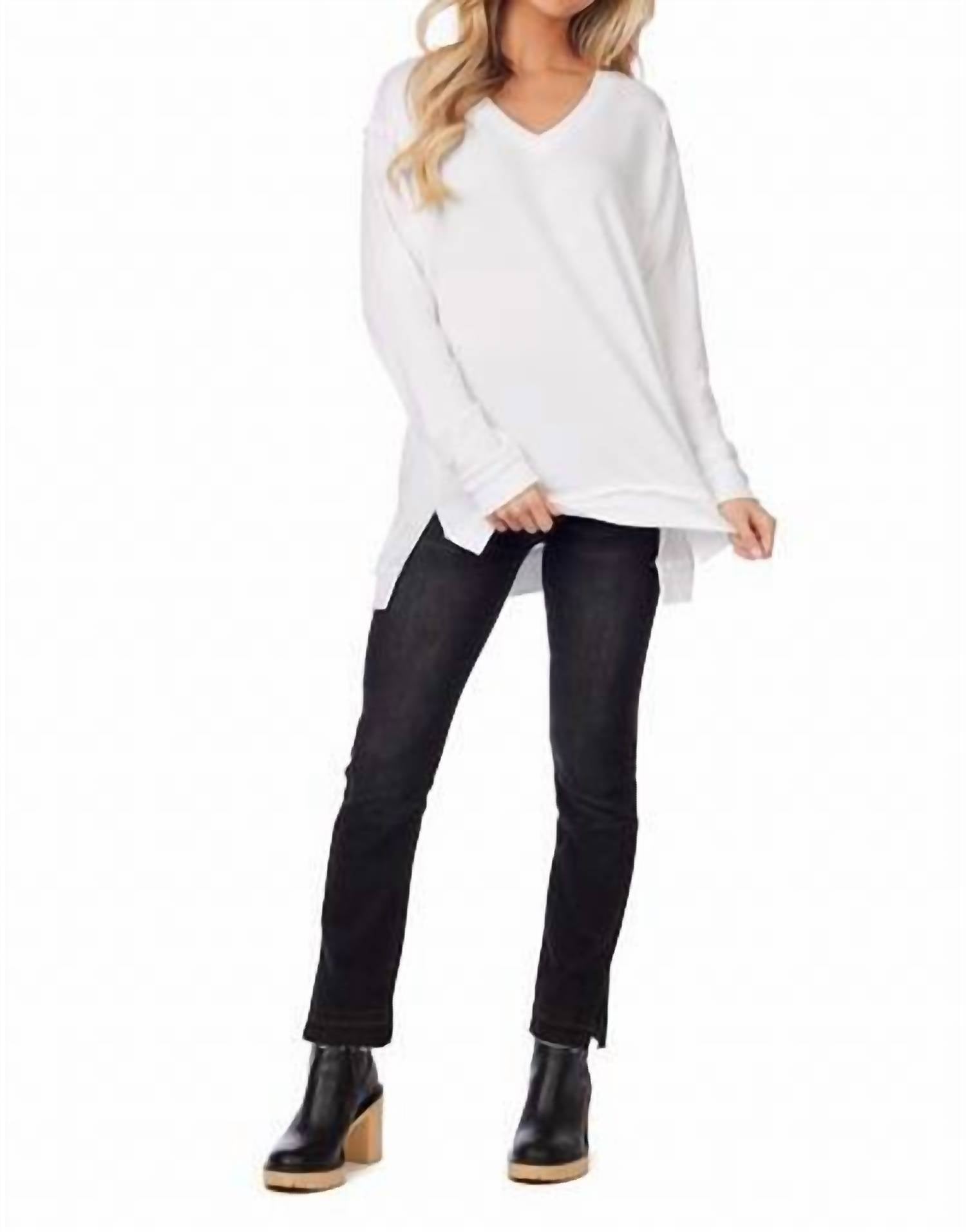 Introducing the Willie Long Sleeve Tee by Mudpie, a stylish and comfortable addition to your wardrobe in classic white. Crafted with long sleeves and a blend of 61% polyester, 36% rayon, and 3% spandex, this tee offers a breathable and durable composition with a length of approximately 26.5" from shoulder to hem. Designed with a ribbed V-neck for a relaxed, trendy look, this solid-patterned tee features a convenient pull-on closure. Care is simple with machine wash cold and tumble dry on low settings. Model Emma is 5'9" with a 34" bust, 26" waist, and 34" hips, wearing the Willie Long Sleeve Tee for a fit that is true to size.