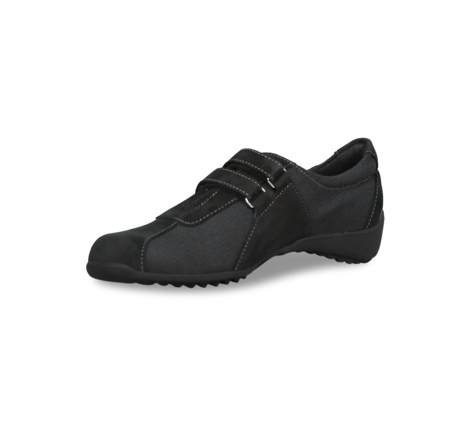 Cute, functional, and comfortable. These sneakers check all the boxes. Experience the ultimate in comfort and style with the Joliet Casual Slip On Shoes by Munro, now in a chic Black Fabric Suede. Assembled in the USA, these sneakers boast a flexible and ultra-lightweight TPU outsole along with a contoured insole fortified with a riveted steel shank for lateral stability. The upper is crafted from soft goat suede and fabric, complemented by a knit lining with moisture management technology. Featuring a convenient hook & loop strap closure, these shoes are designed for women who value both fashion and comfort, perfect for travel and glamorous springtime adventures.