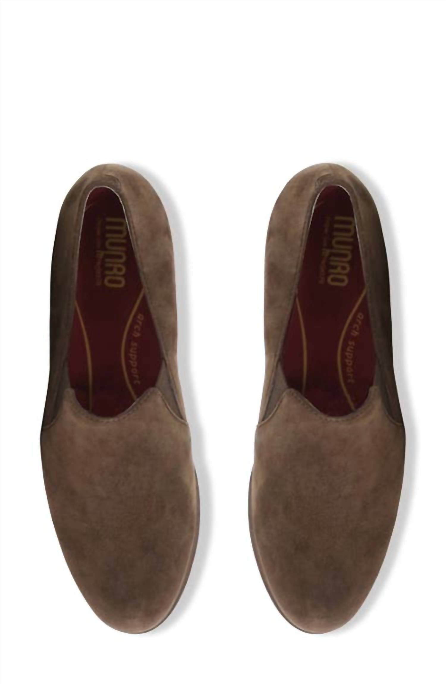 Step into comfort and style with the Women's Kam Loafer by Munro, crafted in elegant brown suede. This loafer features a smart round toe design with elastic insets for easy wear and a contoured cushioned insole with arch support for all-day comfort. The upper is made of a quality blend of leather and textile, complemented by a synthetic lining and sole. These loafers promise both durability and timeless appeal. Imported.