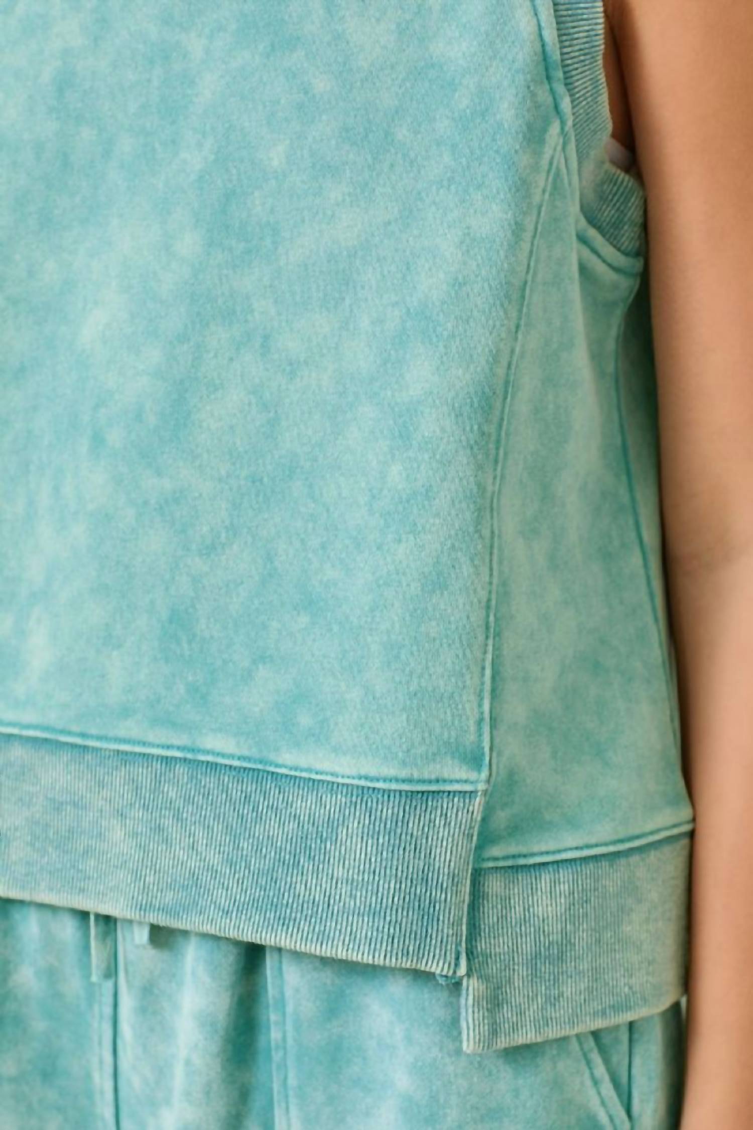 The Bowie Sleeveless Terry Top by Mystree is a stylish addition to any warm-weather wardrobe, with its relaxed fit and ribbed detail offering a nod to '90s fashion. This sleeveless top, perfect for summer vacations, features a textured crewneck design and is crafted from a comfortable cotton blend. With a pull-on closure, it pairs effortlessly with the Bowie Terry Shorts for a complete athleisure set. Care is simple, requiring only a machine wash to maintain its fresh Washed Kingfisher and Sea Green hues. Available in sizes with bust measurements of 38" (S), 40" (M), and 42" (L), and lengths of 21" (S), 21.5" (M), and 22" (L).