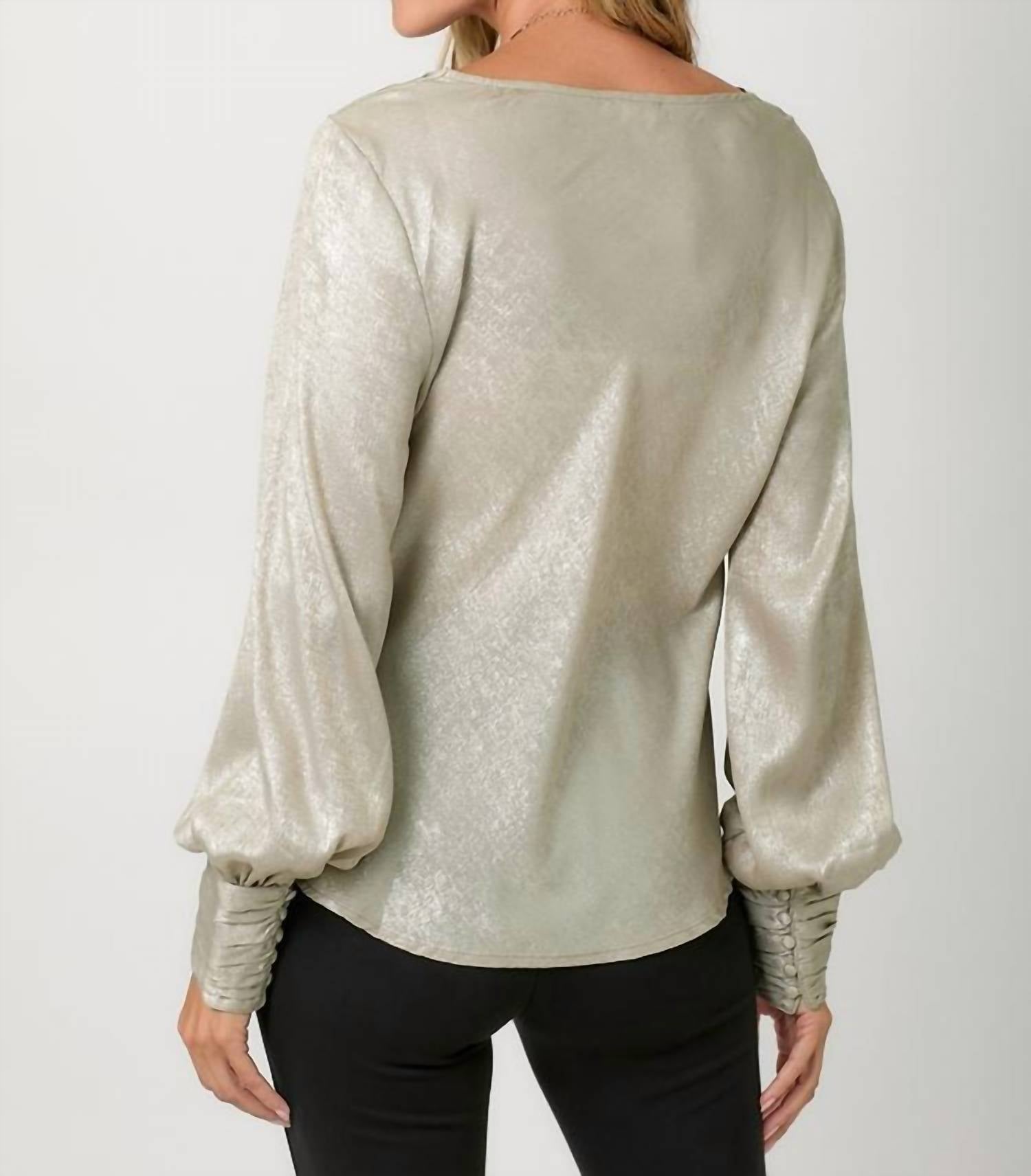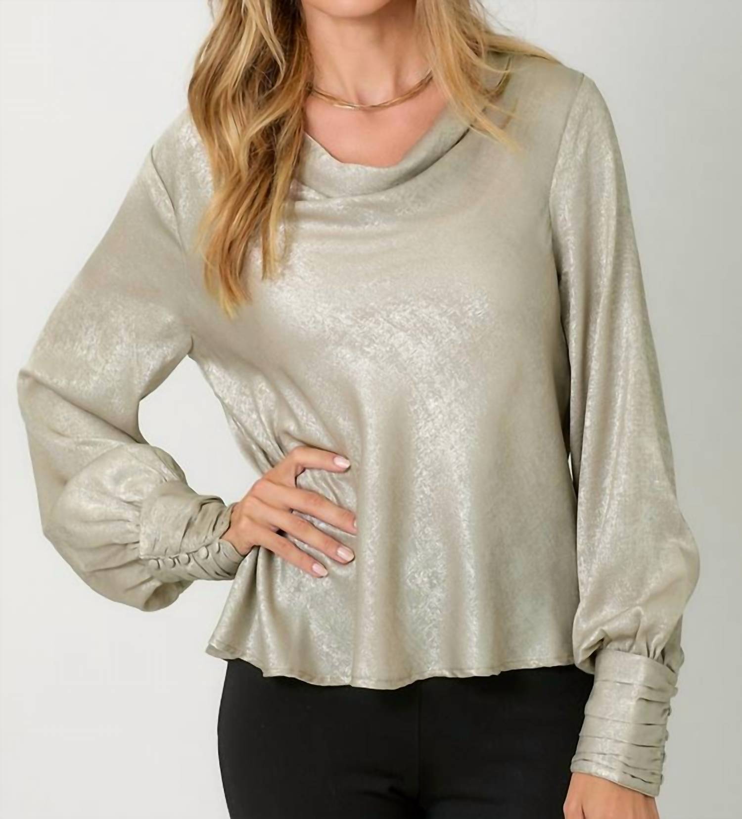 Introducing the Metallic Cowl Neck Blouse by Mystree, a statement piece perfect for evening events this fall. This women's blouse features long bubble sleeves and a chic cowl neckline with a pull-on closure, offering both style and comfort. Crafted from 100% solid-patterned polyester with a striking hi-lo hem, it's made in China. For care, hand wash as needed to maintain its luxurious gold shimmer.