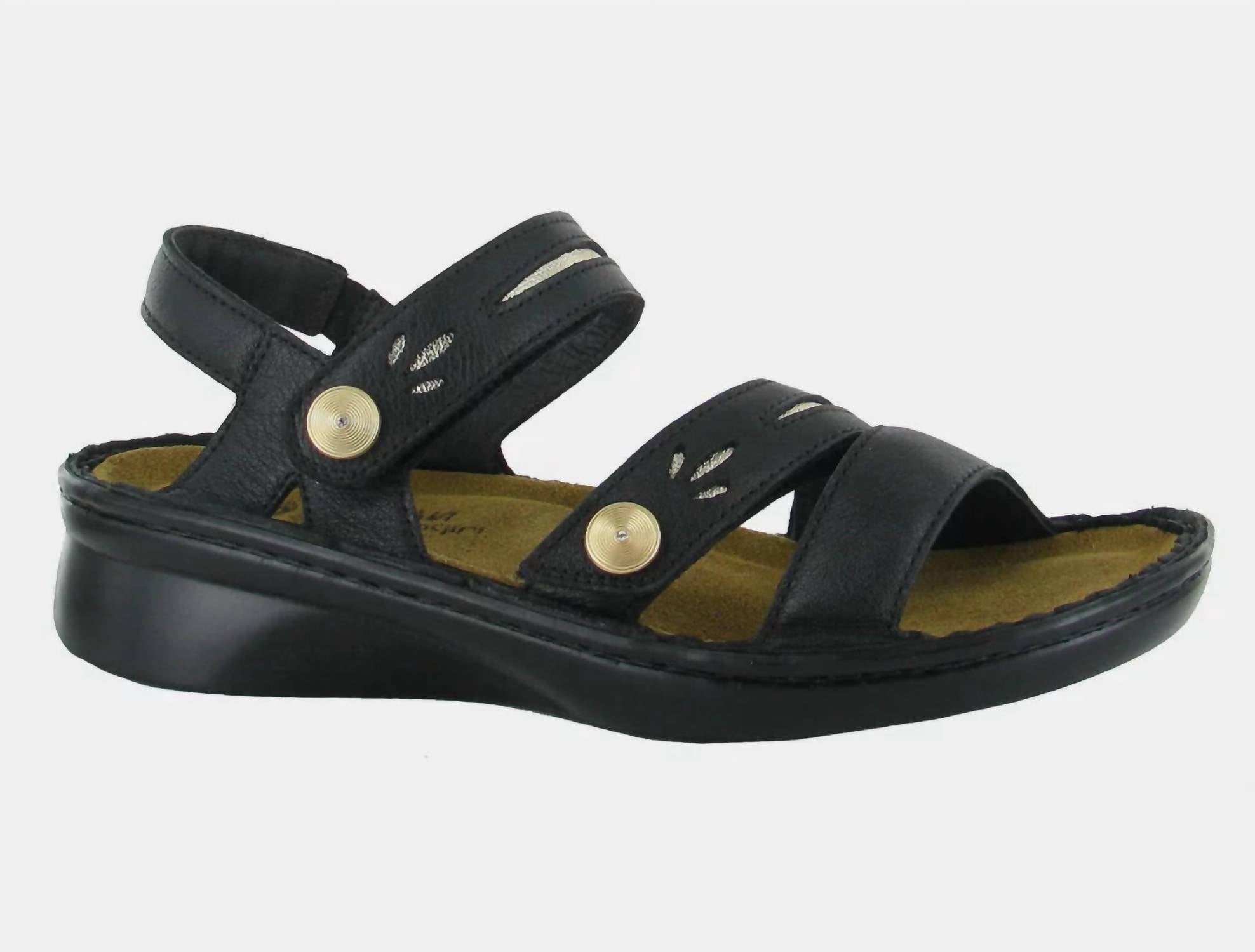 Clássico e charmoso, perfeito para usar o dia todo. Adoramos esta sandália. Esta sandália de couro Cadence possui fechos ajustáveis em velcro, palmilha anatômica removível de cortiça e látex e solado leve de poliuretano de 4 cm. Confeccionada em couro macio, oferece conforto e suporte com salto anabela baixo, ideal para tamanhos médios a grandes.