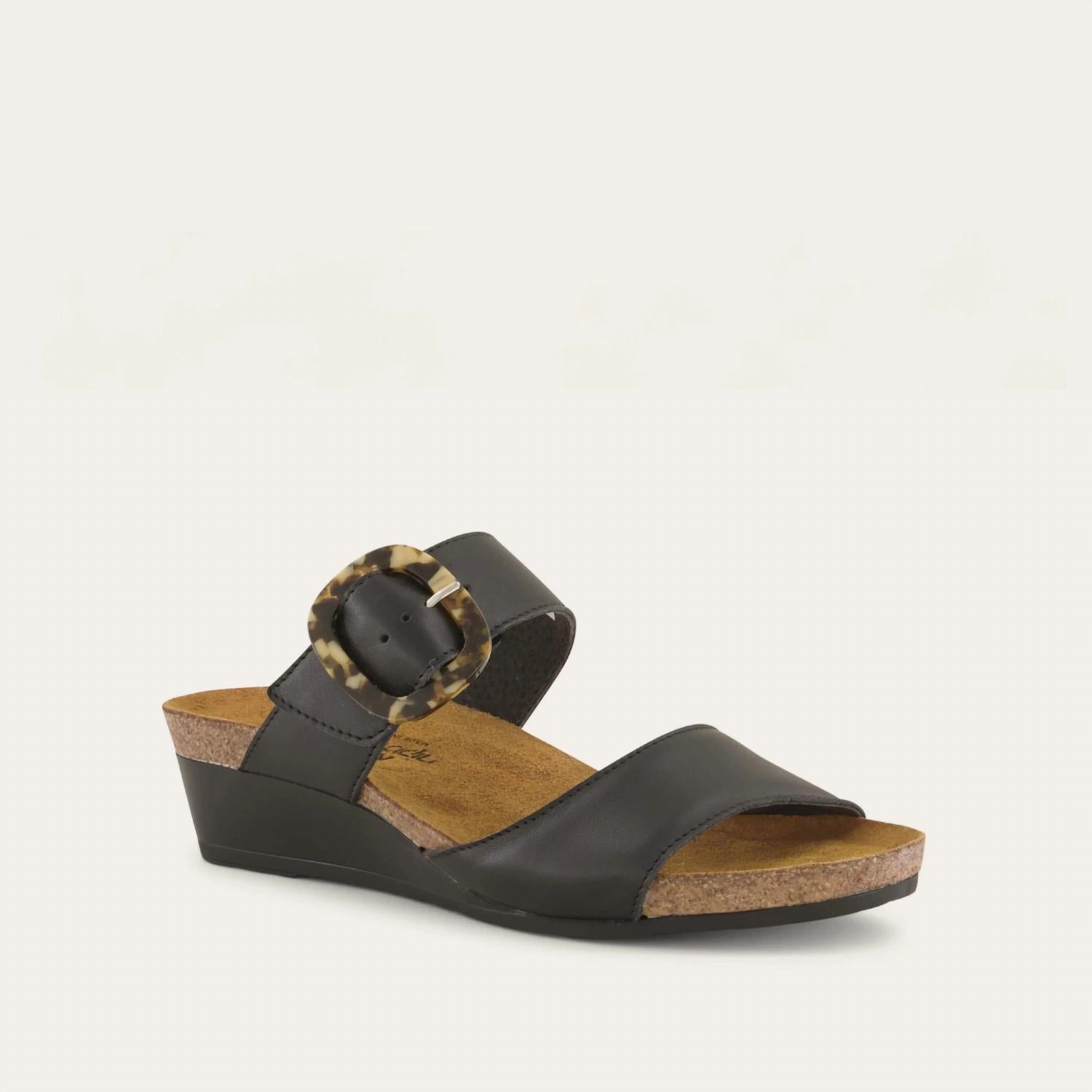 Timeless wedges that will be relevant season after season. Introducing the Women's Kingdom Sandal by NAOT, a stylish choice for any occasion with its fashionable oversized buckle. Crafted in a chic Nubuck and Suede, this sandal features an open toe design with a comfortable, anatomic cork and latex footbed that adapts to your foot's shape over time. Its low 1.75" wedge heel adds a gentle lift, while the polyurethane sole ensures durability. A perfect blend of comfort and style, this sandal is true to size with the recommendation that half sizes size up.