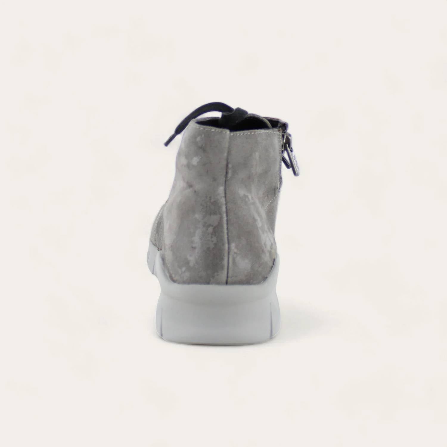 Uma opção esportiva indispensável em Cinza Foggy/mármore. Apresenta bico arredondado e salto plataforma de 4 cm para um ajuste elegante. Sua composição inclui um solado de poliuretano durável, antiderrapante e adequado para órteses, mantendo um ajuste de largura média. Desfrute de conforto o dia todo com a palmilha removível de cortiça e látex. Os zíperes externos facilitam o calce.