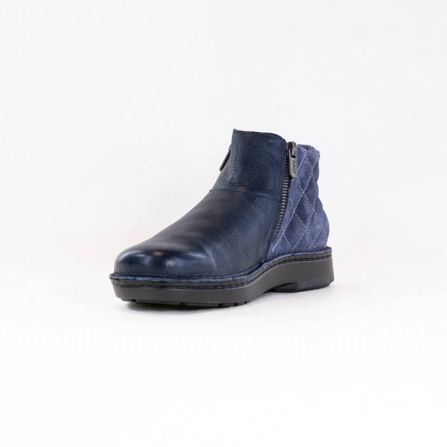 Meet the Women's Sintra Ankle Boot by NAOT, a perfect blend of style and comfort in vibrant Midnight Blue Suede. Featuring a convenient lace-up closure with side zippers, this boot offers easy accessibility while maintaining a secure fit. Its padded tongue and heel cup ensure added stability and comfort, complemented by Naot's removable, anatomic cork and latex footbed wrapped in suede. Enjoy the lightweight, durable, and slip-resistant 1" polyurethane sole from the Koru Collection, expertly crafted with hand-sewn Strobel construction for enhanced flexibility. Ideal for fall events, from music festivals to casual outings, this round-toe design epitomizes effortless chic with a western twist.
