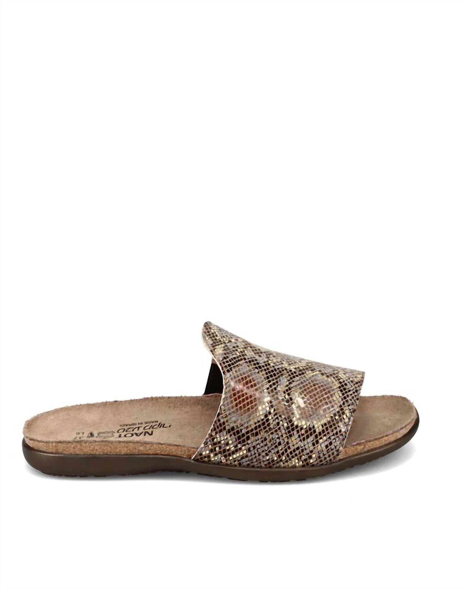 Vestidos fluidos, calças cropped e até macacões... esta sandália combina com todos! Da coleção Elegant Flats. Forro em couro macio. Salto anatômico de cortiça e látex de 2,5 cm. Cor: Couro Python Dourado (EC7).