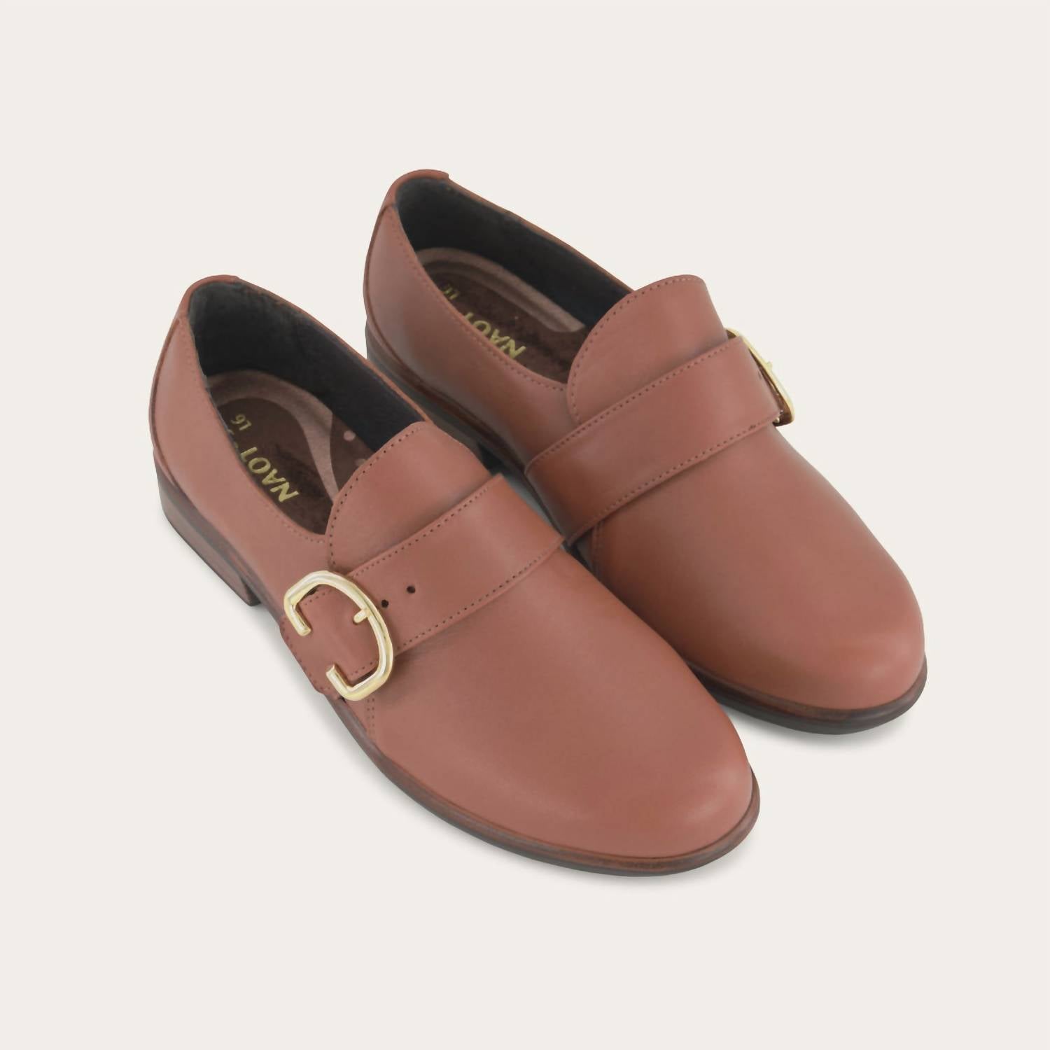 Uma versão elegante e feminina do clássico mocassim. Apresenta um salto bloco de 1,5" composto por poliuretano para maior durabilidade, com um elegante detalhe de fivela para realçar seu visual elegante. Perfeitamente adequado para órteses, vem com palmilha removível de cortiça e látex, proporcionando conforto durante todo o dia. Embora não possua características antiderrapantes, sua largura média e bico arredondado garantem um ajuste confortável para as mulheres.