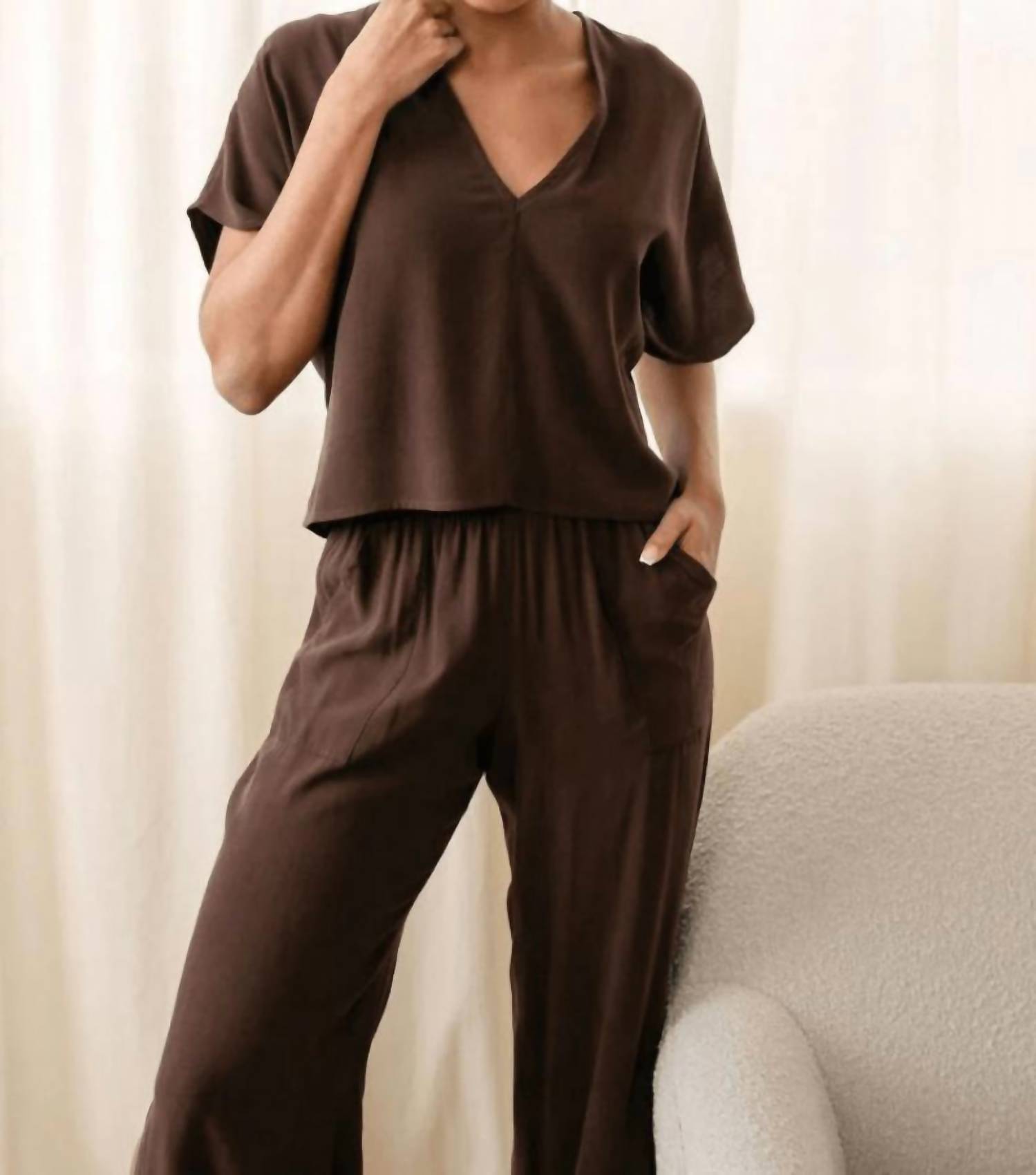 Discover the Easy T Box Top by Natalie Busby, a minimalist staple in a rich Espresso hue, crafted for women who appreciate effortless elegance. This tee features short sleeves, a V-neckline, and a chic, cropped fit, perfect for showing off your favorite pair of pants. Made from a luxurious blend of 63% Tencel and 37% Viscose, it offers comfort and a touch of sophistication, originating from Nashville, TN. The pull-on style simplifies your dressing routine, while the care instructions recommend machine wash in delicate cold and line drying, ensuring lasting quality.
