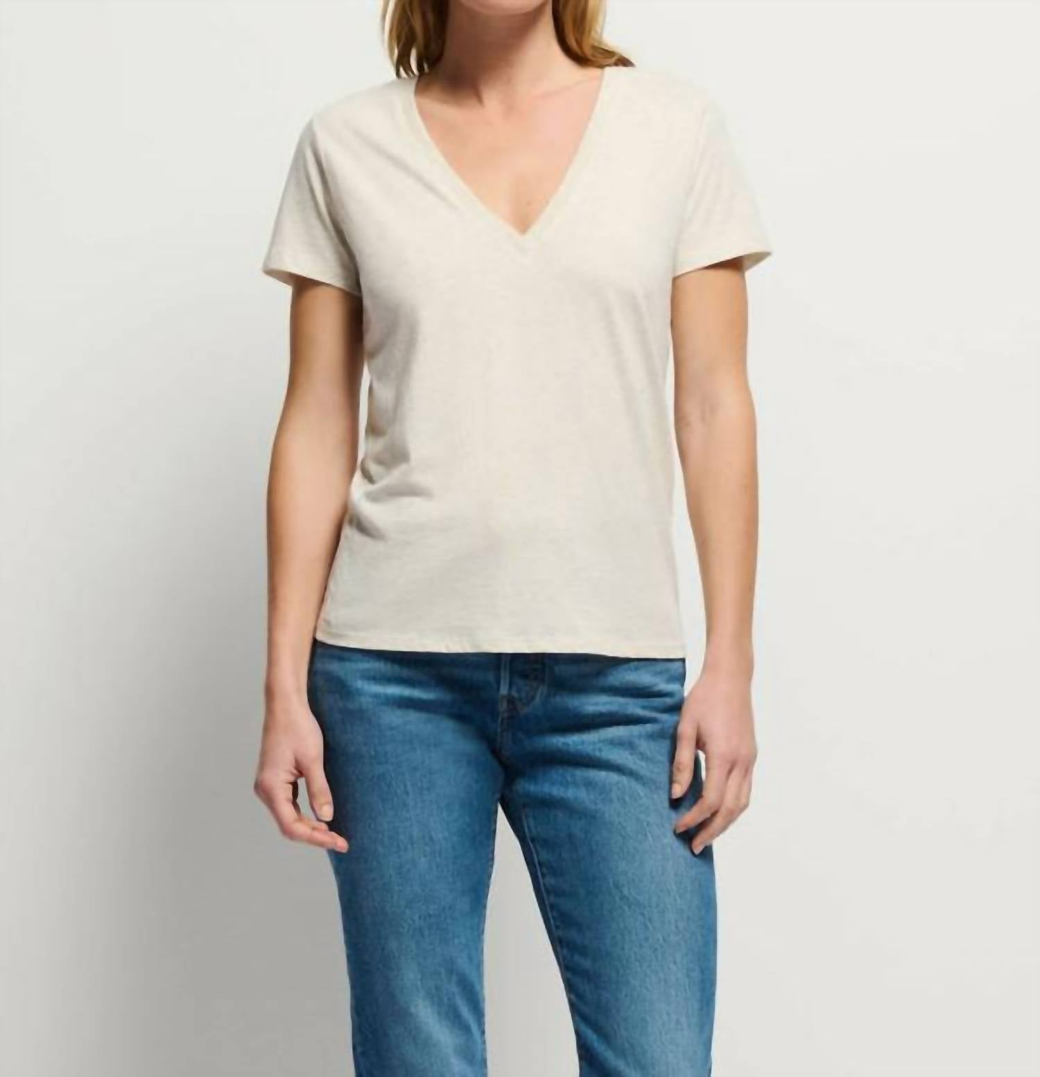 Introducing the Blair Slim Tee Top by Nation LTD, a minimalist, universally flattering piece in an elegant heather oatmeal color. This short sleeve tee is crafted from soft, hand-harvested Peruvian Organic Cotton, offering a contoured silhouette that's both environmentally responsible and comfortable. With a deep, narrow V-neckline, it is bra-friendly and features a pull-on closure. Care for it easily with a machine wash and lay flat to dry.