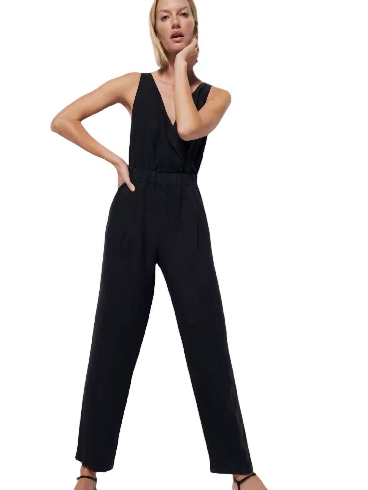 Não é preciso muito para que esta peça única fique descolada sem esforço. Adicione algumas joias chamativas para dar um toque especial ou calce tênis para um visual mais casual. Este macacão com decote em V da Kiara apresenta decote em V cruzado, cintura elástica e modelagem reta. Confeccionado em 100% linho leve, oferece um caimento relaxado com detalhes que combinam com sutiãs e um zíper discreto para conforto e estilo.