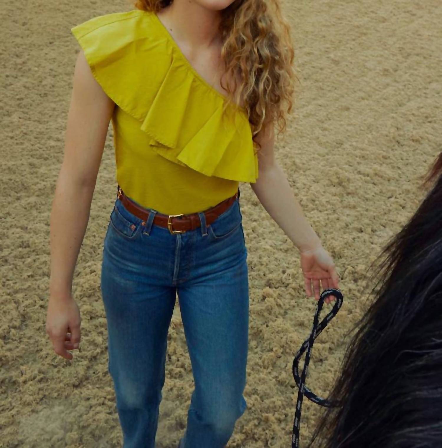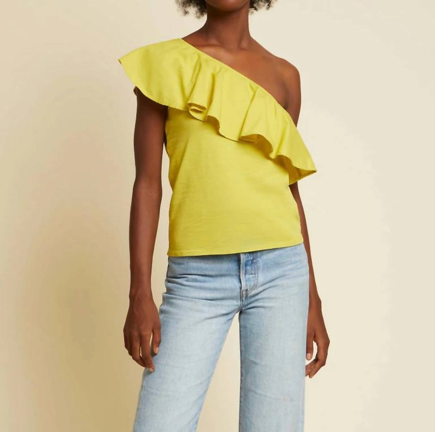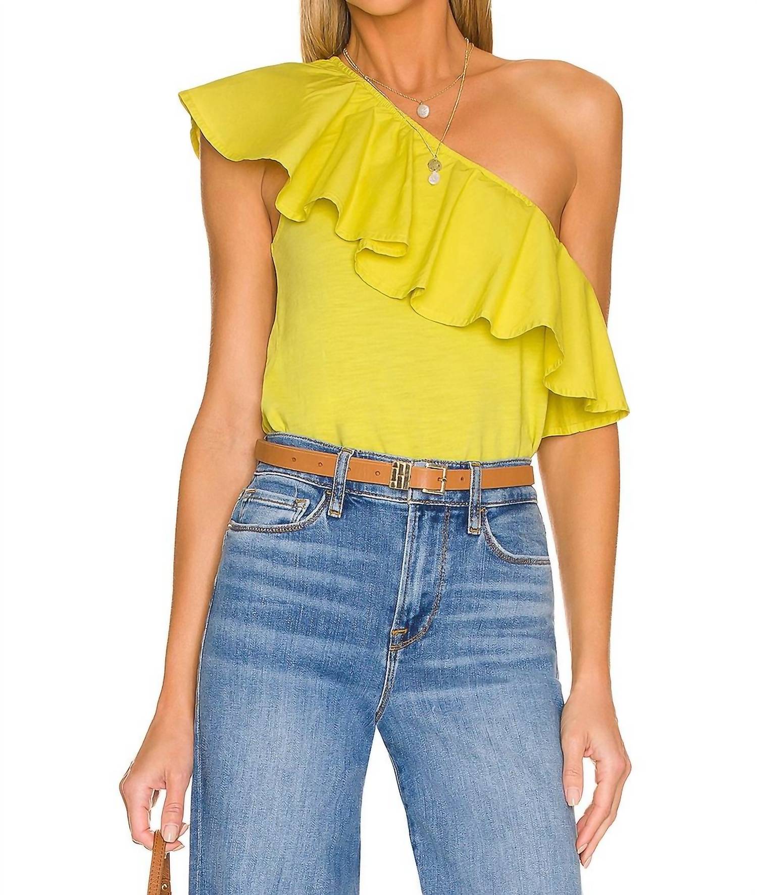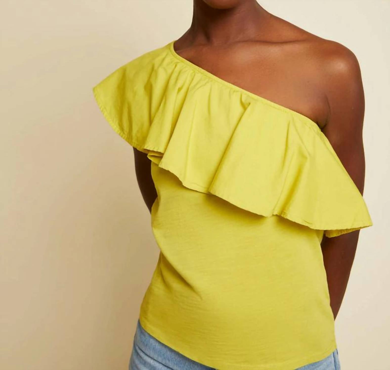 Uma blusa versátil que vai do escritório ao jantar! Com o drama dos babados de popeline de algodão stonewashed em um corte de um ombro só, ninguém vai notar que você está usando uma camiseta. Prenda o cabelo em um coque alto e coloque um par de argolas douradas – você está pronta para o verão e sairá de casa em 5... Chartreuse e Preto. Corte slim. Slub pesado/Lavável à máquina. Fabricado no Peru.