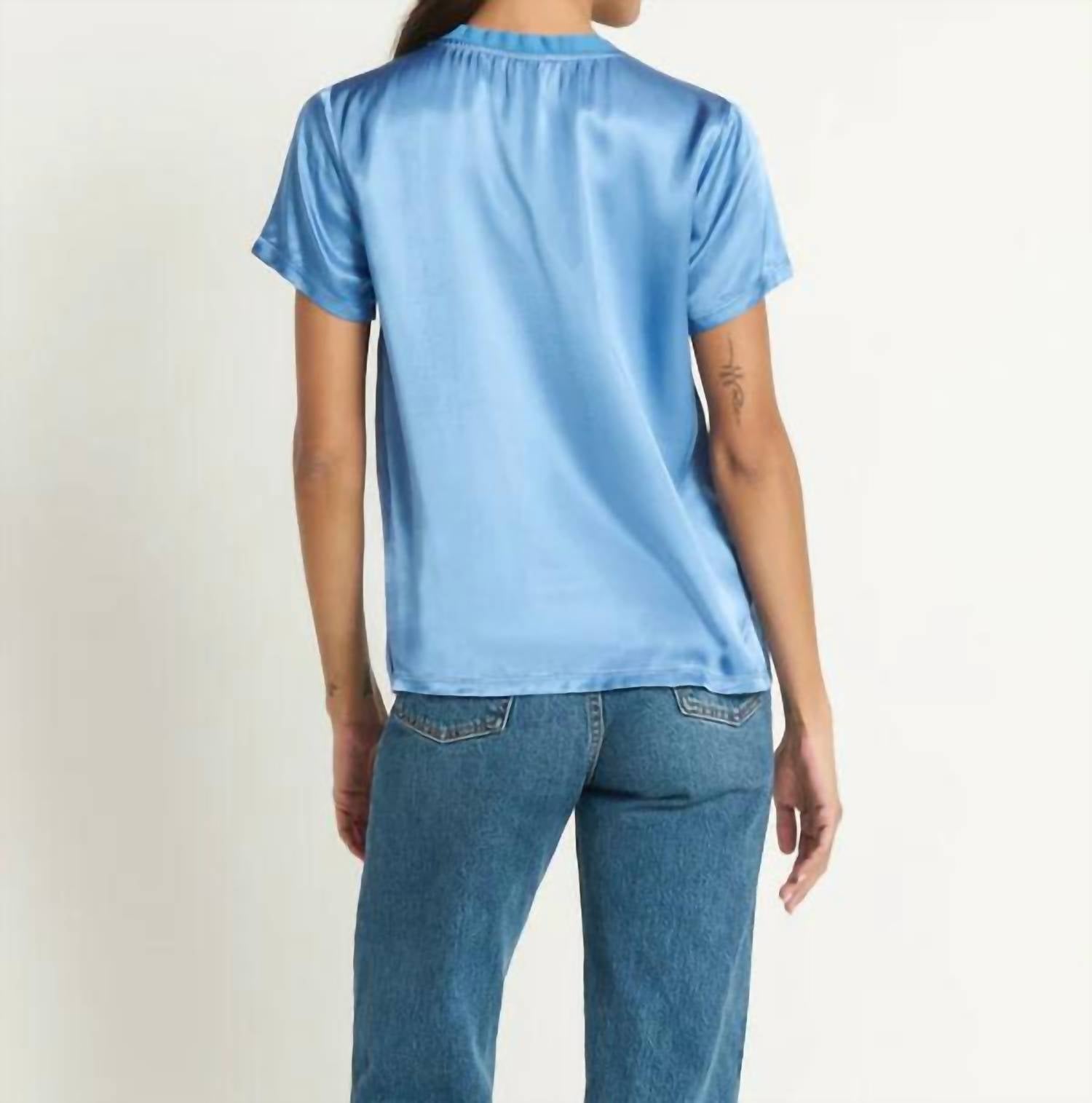 Look no further, you just found your perfect tee! Introducing the Women's June Satin Top by Nation LTD, a chic addition in Harbor Blue that's perfect for any summer getaway. This short sleeve tee elevates your casual wardrobe with its luxurious hammered satin material and laid-back ribbed neckband. Designed with a flattering V-neckline, it features a convenient pull-on closure for easy wear. Ideal for vacation vibes and streetwear trends alike, this top brings effortless style to your closet.