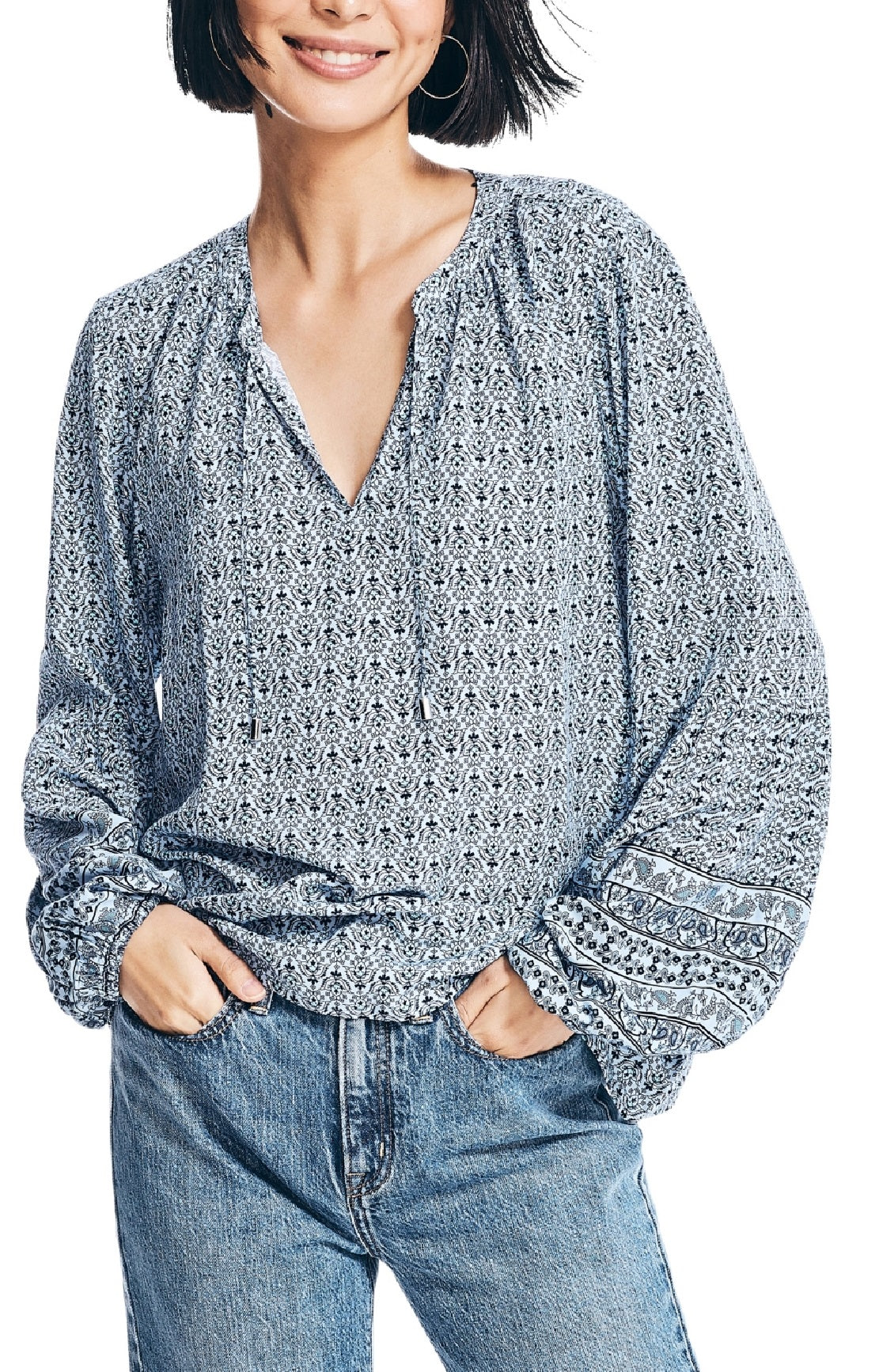 Incremente seu visual com esta blusa com estampa paisley, confeccionada em tecido artesanal. Este modelo é complementado por uma gola aberta e o logotipo da Classe J, assinatura da Nautica, na bainha. | Cordões para amarração | Mangas longas | Punhos elásticos | Caimento clássico | Este item comprado online deve ser devolvido ao vendedor somente por correio. Este item não pode ser devolvido em lojas. | 100% Rayon