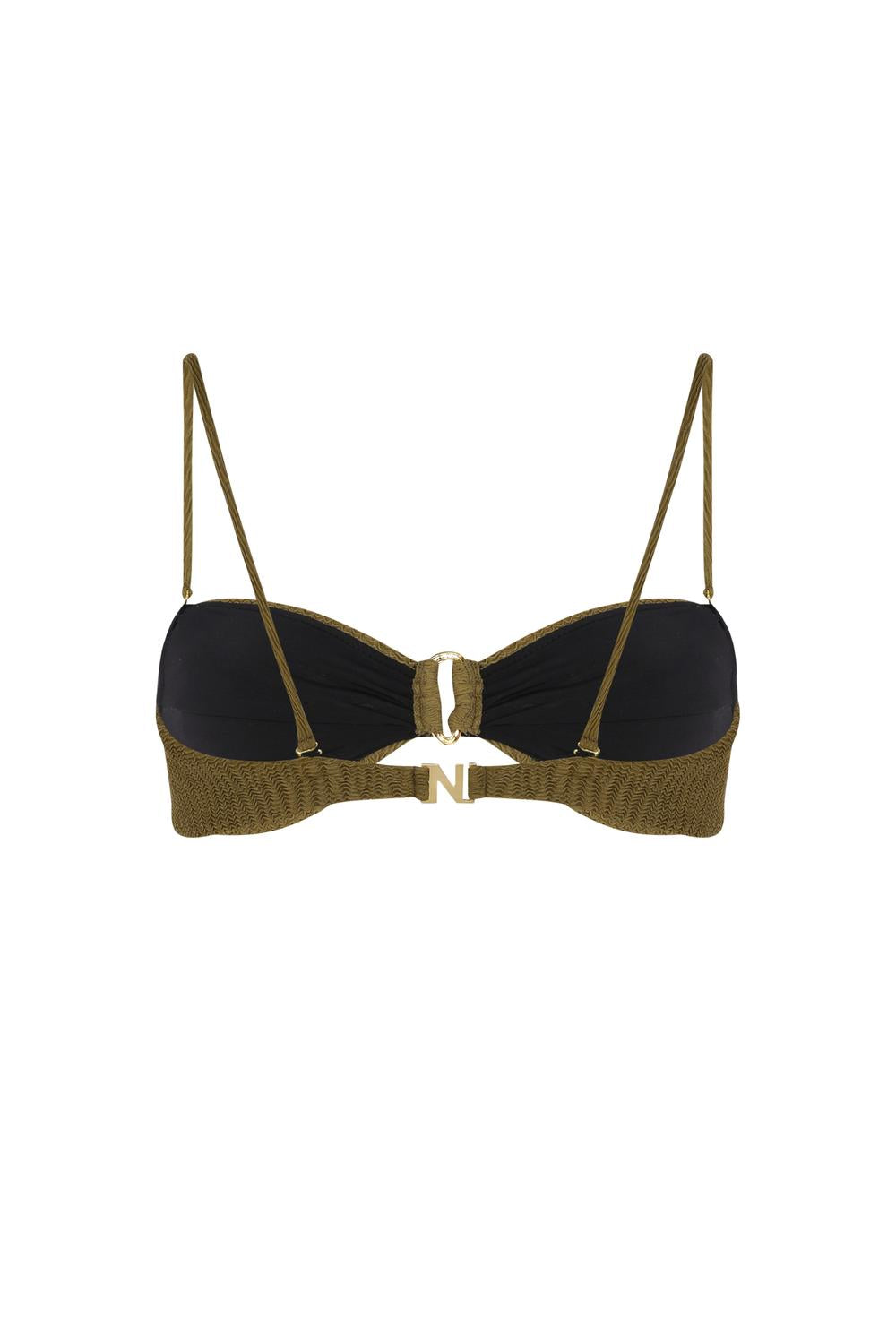 Este maiô fofo e elegante é perfeito para dar um mergulho na piscina, relaxar em praias ensolaradas e permanecer estilosa durante o próximo verão. Apresentamos o Top de Biquíni Ondas Crinkle Bandeau da Nelblu, criado para um look chique de praia em um elegante tom Olivo. Este top de biquíni possui alças removíveis e um elegante anel dourado no centro. Desfrute de cobertura ajustável com seu design ousado. Cuidados: Lave com água fria e sabão neutro, evite amaciantes e seque à sombra. Evite o contato com superfícies ásperas para manter a integridade do tecido.