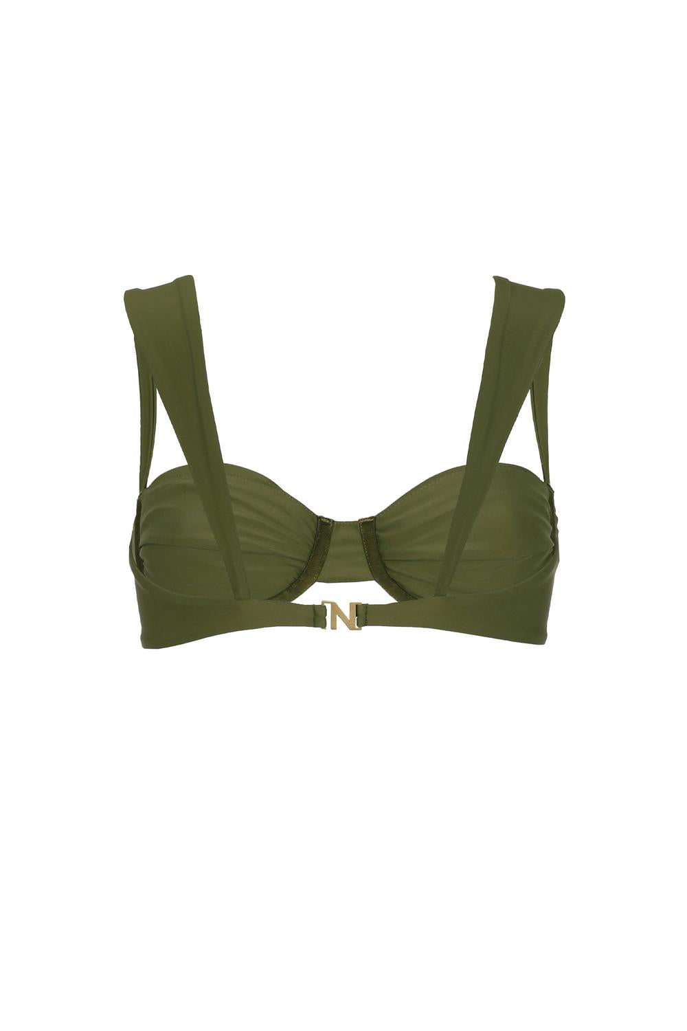 O Top de Biquíni Plissado Travesia da Nelblu na cor Dinosaurio é a escolha perfeita para dias de praia cheios de estilo. Possui bojos com aro e alças largas para maior sustentação, além de um fecho traseiro elegante com logo dourado plissado. Feito com cuidado, ele foi criado para o verão, com cobertura ousada e estampa sólida. Para melhores resultados, lave com água fria e detergente neutro, evite torcer e seque à sombra sem usar amaciantes.