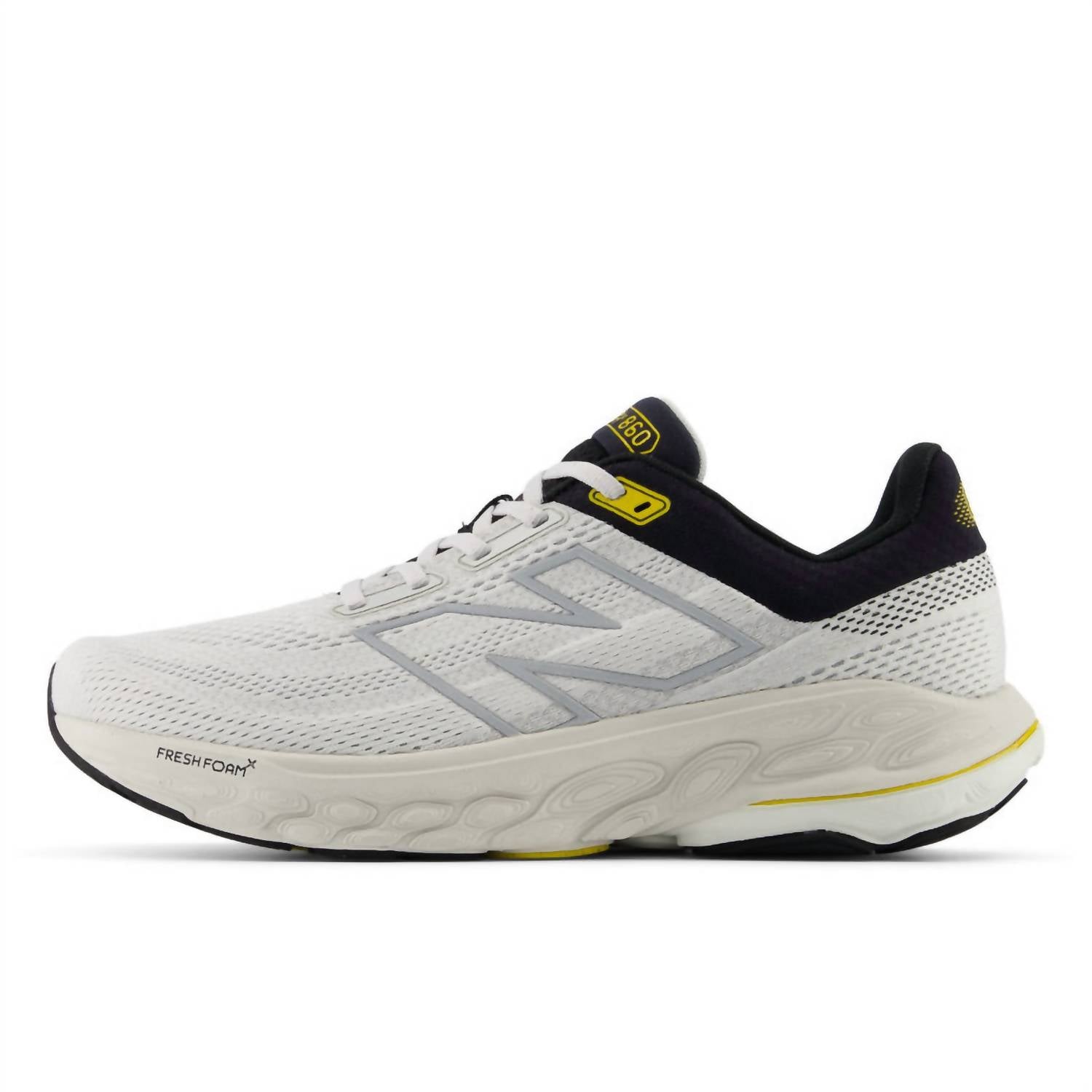 Introducing the Men's 860 V14 Running Sneakers by New Balance, masterfully designed for both long-lasting reliability and comfort over any distance. These sneakers feature a supportive synthetic upper, a Fresh Foam X midsole with approximately 3% bio-based content, and innovative Stability Plane technology for exceptional cushioning and stability. Weighing 306.5 grams (10.8 oz), they are equipped with a rocker profile and a low flat heel, making them ideal for performance-driven athletes. Available in a striking White with Black and Sea Salt color combination, these shoes offer a rounded toe shape, ensuring a comfortable fit for every adult man.