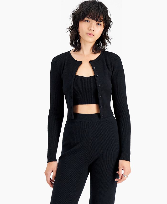 O conjunto Olivia da Nia acerta em cheio no estilo com uma regata curta e um cardigã de botões combinando