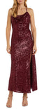 Uma fenda na altura da coxa confere movimento a cada passo neste deslumbrante vestido de lantejoulas da Nightway. | Aproximadamente 57 de comprimento, do centro do pescoço até a bainha. O comprimento é baseado no tamanho 10 e varia 1/4 entre os tamanhos. | Vestido formal longo | Gola alta | Zíper traseiro oculto com fecho de colchete | Lantejoulas em toda a peça; fenda frontal