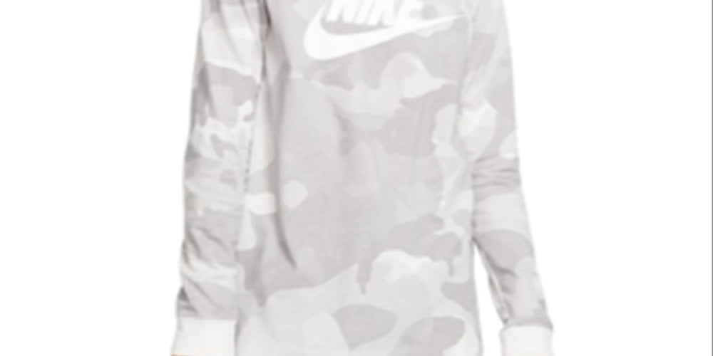 Camiseta camuflada cinza para meninos, tamanho P 8-9, de algodão elástico, mangas compridas, gola e punhos brancos.