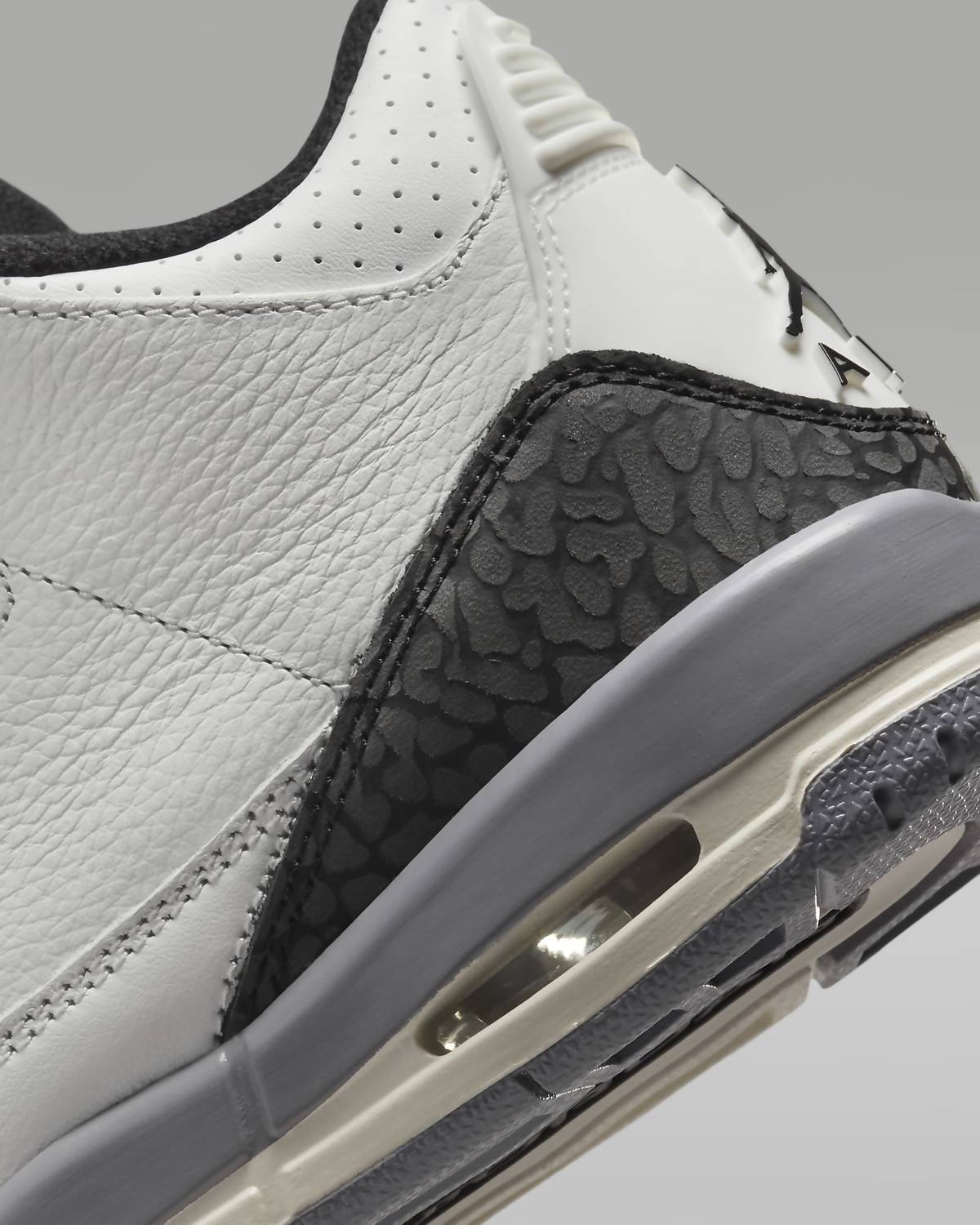 The AJ3 sneaker features a Summit White/Cement Grey/Black/Fire Red colorway and is modeled after Michael Jordan's game shoe from the '80s. It includes a soft collar for comfort around the ankle, a flexible foam midsole for support, and a solid rubber outsole for traction. Style number: DM0967-106. Made in Indonesia.