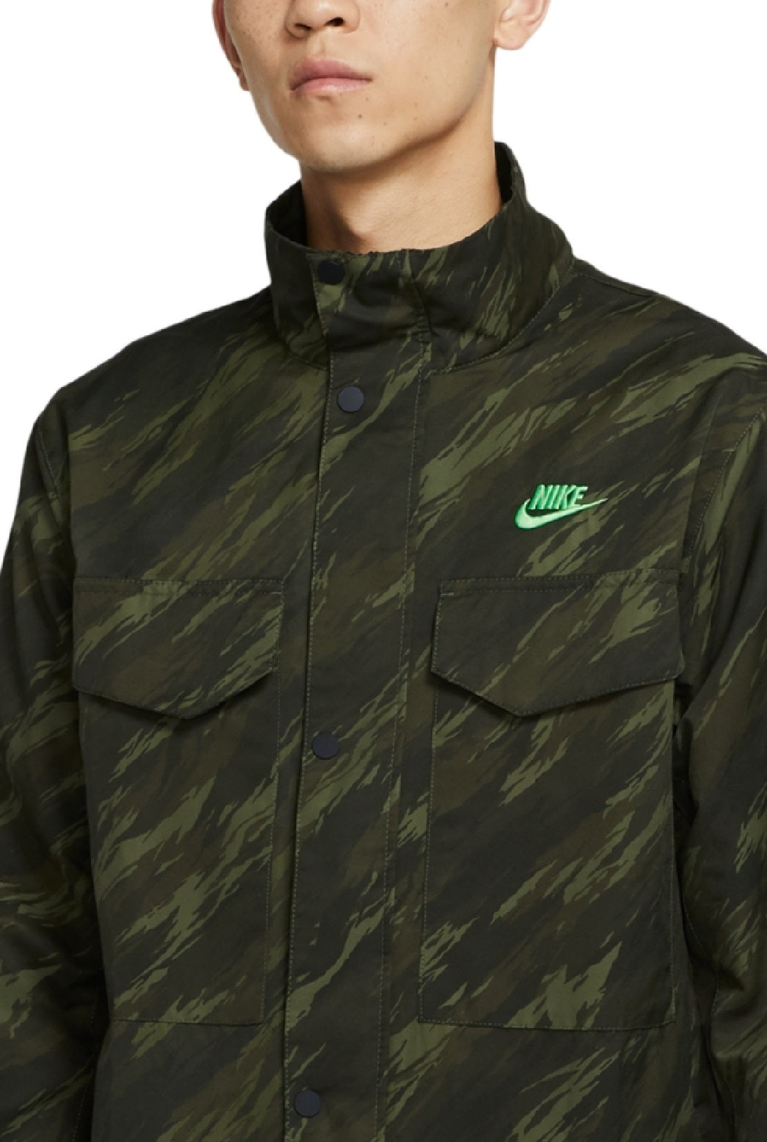 Com estampa camuflada completa, esta jaqueta Sportswear M65 apresenta um design de inspiração militar e fecho de zíper com aba de pressão contra tempestades para ajudar a manter os elementos afastados. Ajuste clássico, gola alta, fecho de zíper completo, dois bolsos frontais para as mãos e dois bolsos com aba no peito. Algodão/nylon