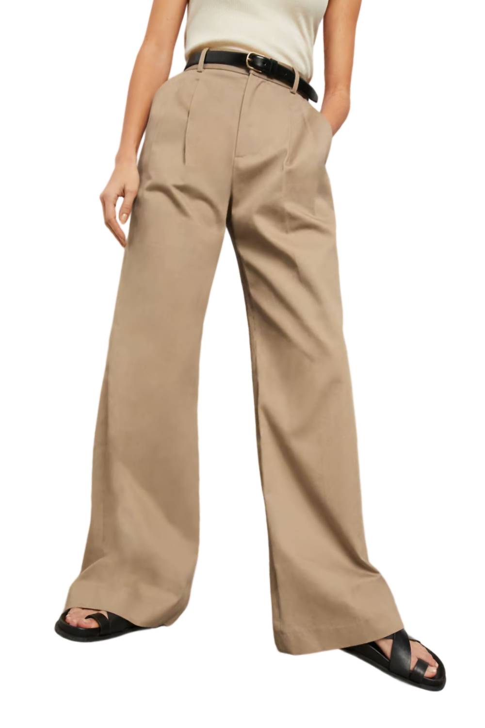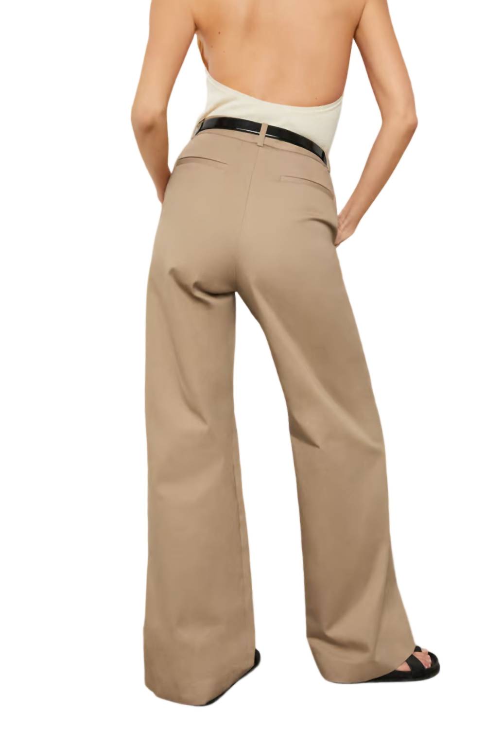 Sarja de algodão cáqui. Desenhada com cintura média elegante, pregas frontais duplas e bolsos; fenda frontal, debrum nas costas. A modelo tem 1,78 m, busto 84 cm, cintura 61 cm, quadril 86 cm e veste tamanho 4. Lavagem à máquina com água fria. 100% algodão.
