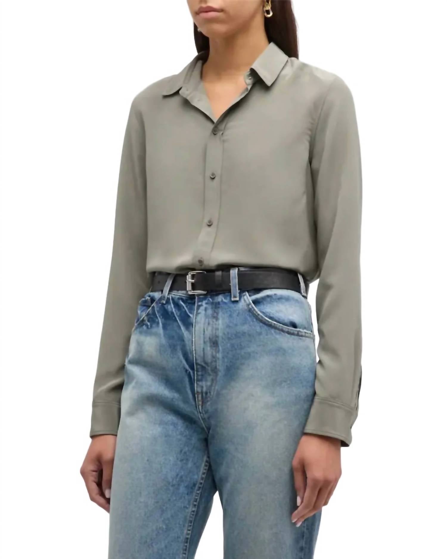 Uma blusa versátil que pode ser usada do escritório ao jantar! Camisa clássica de manga comprida com botões e gola, em crepe de chine de seda com efeito amassado. Modelagem reta e justa. Pala traseira. Detalhes clássicos de carcela. Tingida para combinar com os botões do logotipo. Fabricada nos EUA. 100% SEDA.