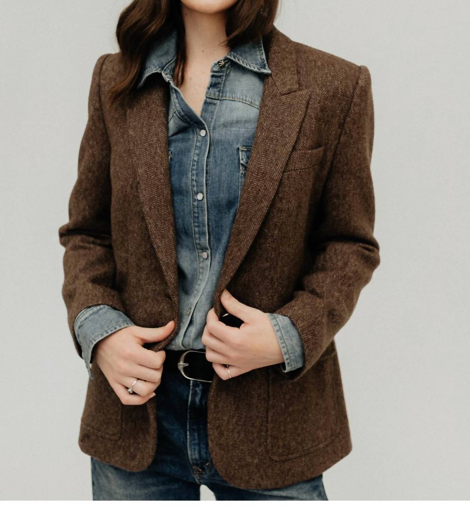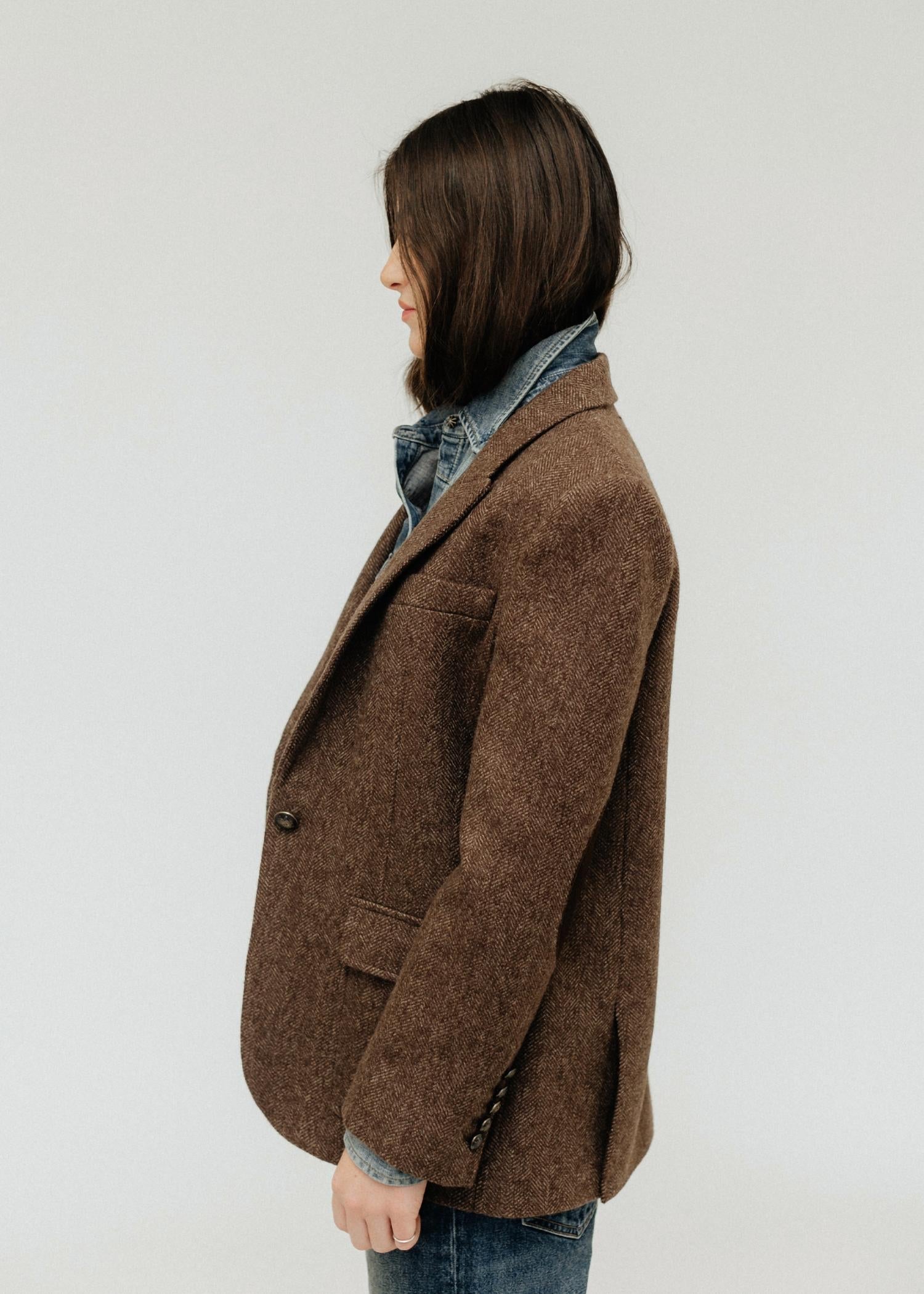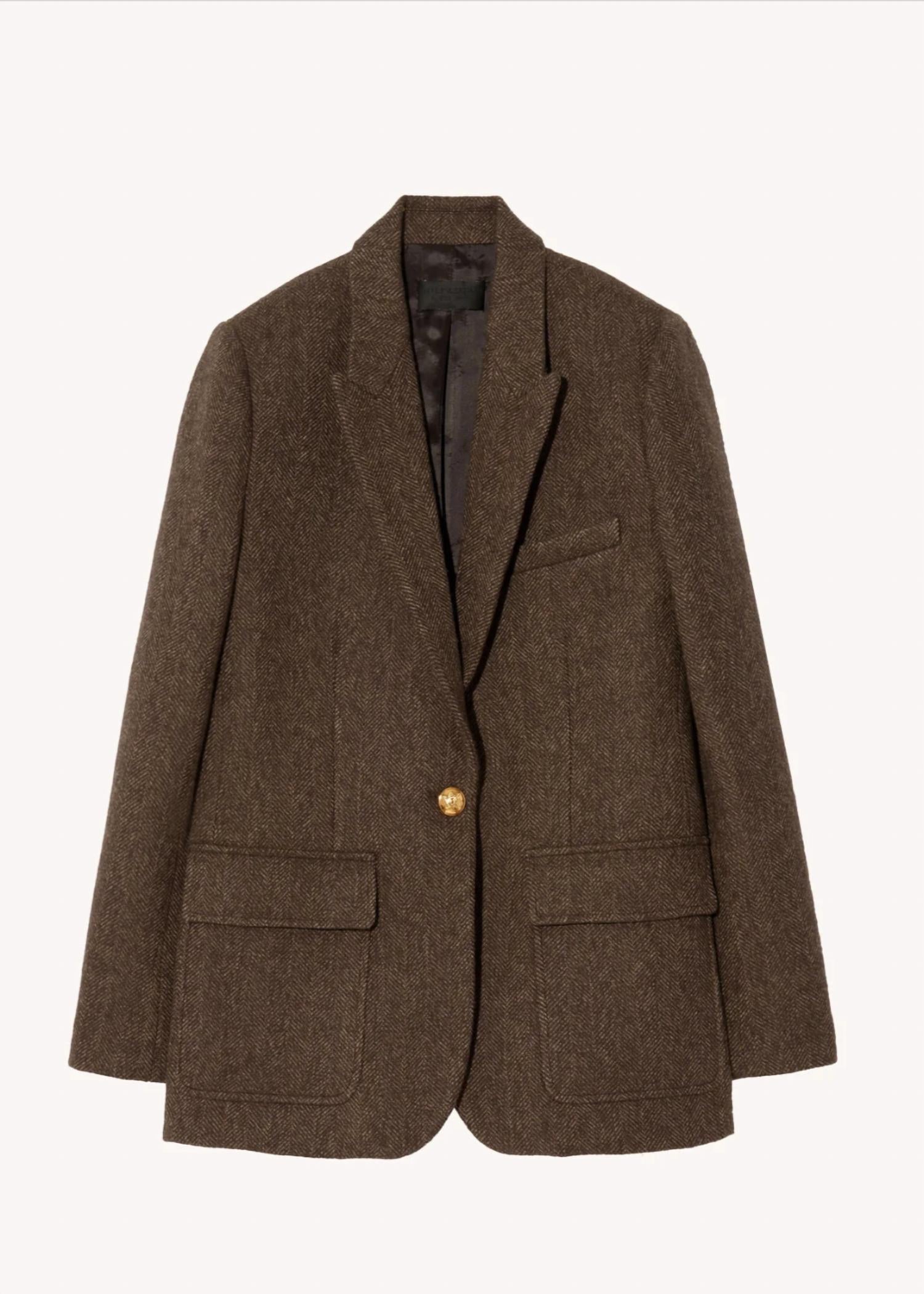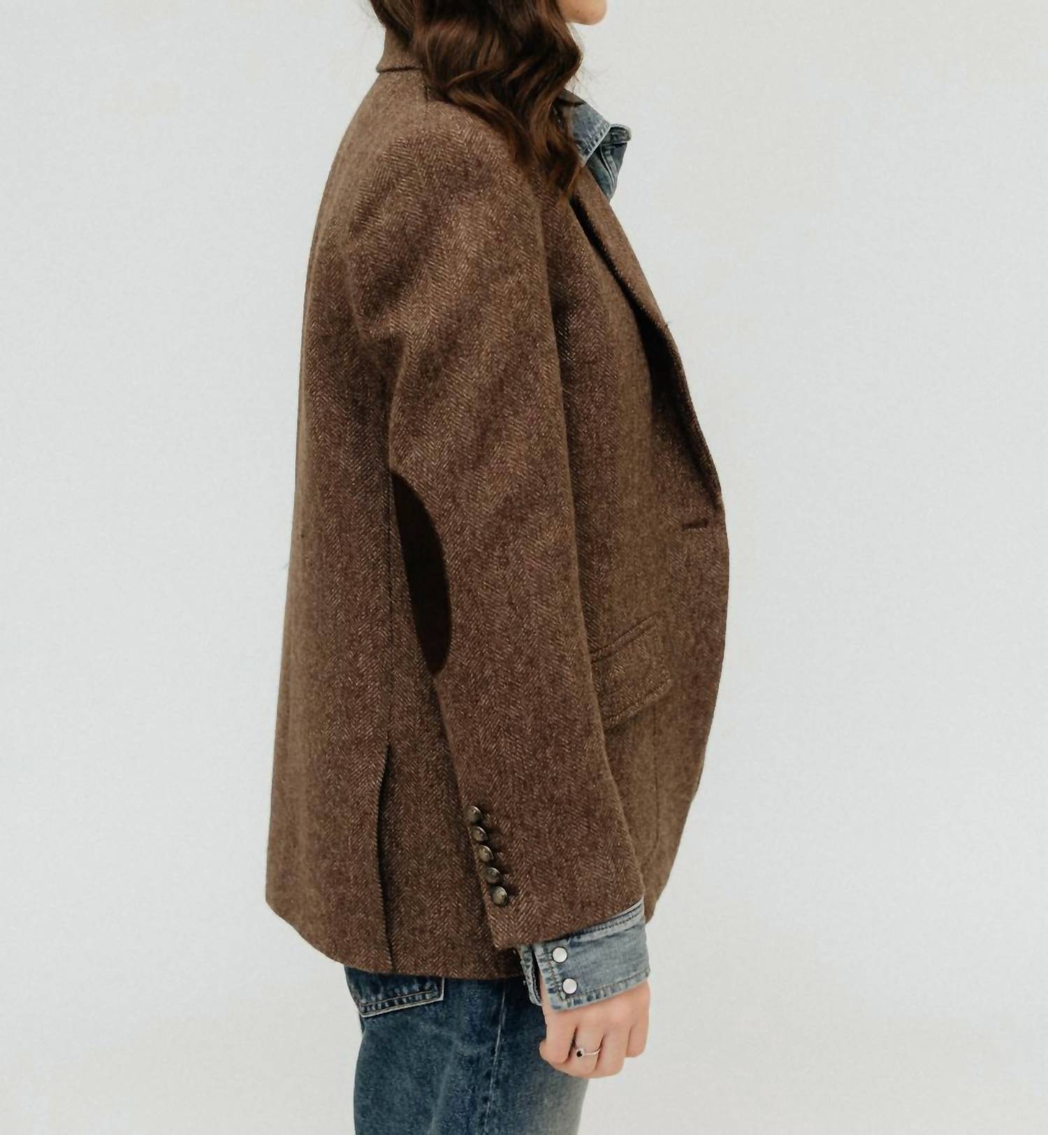 Blazer oversized elegante em sofisticado tom espinha de peixe marrom. Confeccionado em 100% lã virgem. Possui mangas longas, gola refinada e cotoveleiras em camurça. Destaca-se pelo fecho em botão com brasão em latão envelhecido e bolsos práticos. Experimente a união do design lúdico com o flare estruturado com suas ombreiras habilmente ajustadas e costuras princesa.