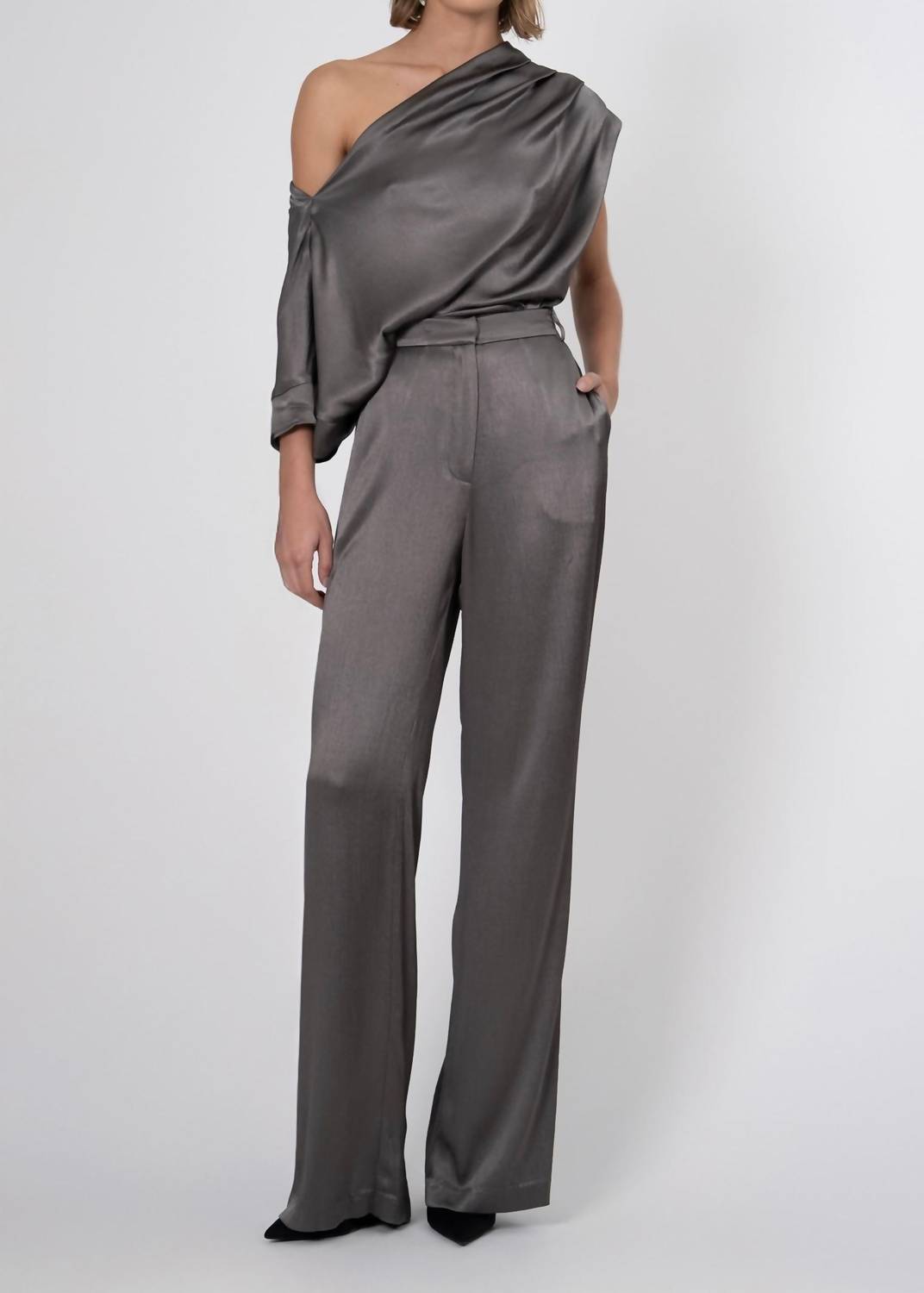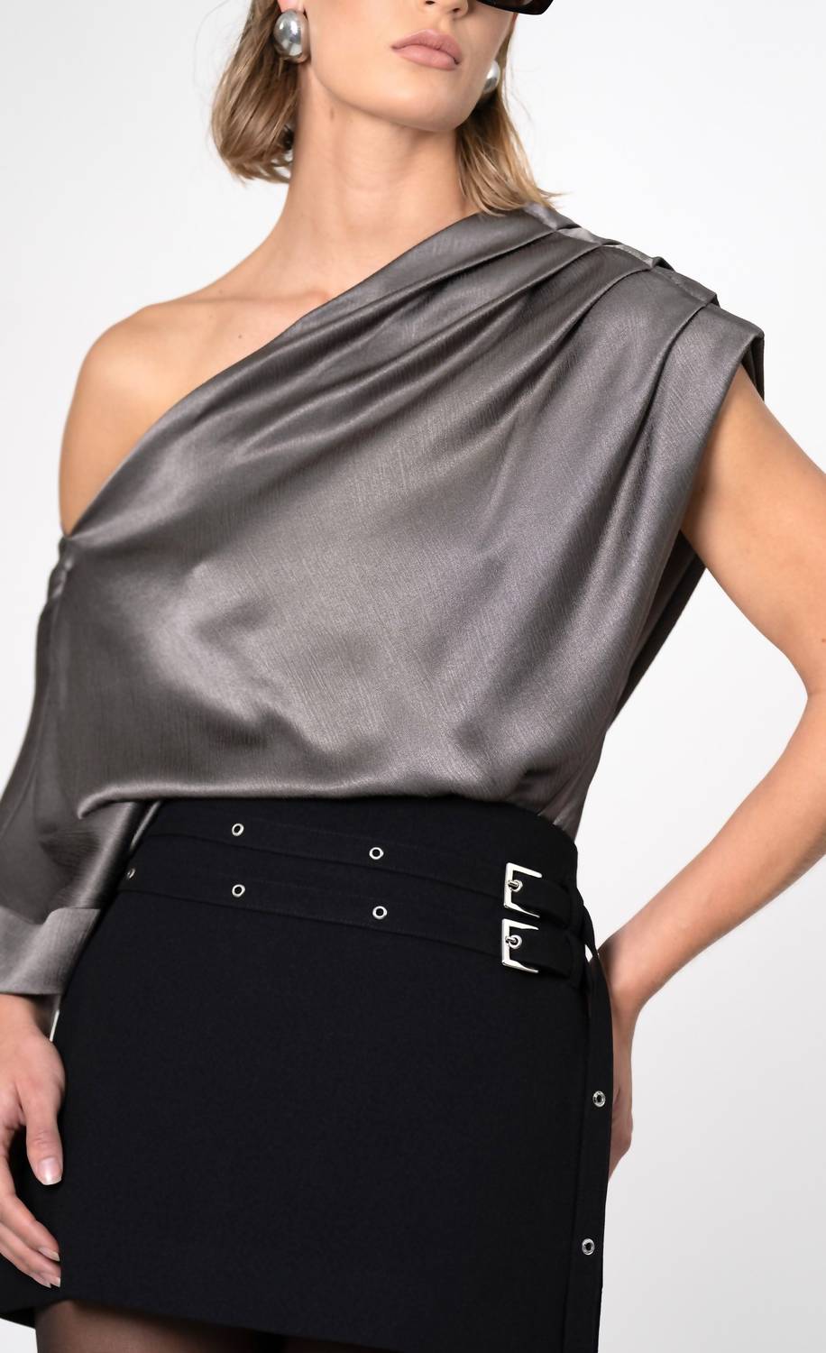 Introducing the Kenzie One Shoulder Top by Nonchalant Label, a chic and elegant piece in a solid gray shade perfect for any occasion. This sleeveless top, with its sophisticated off-the-shoulder neckline, is designed for a sleek, modern silhouette. Closure: Pull on. Care: Dry clean only. The model is wearing a size XS, and the top runs true to size, making it a flawless fit for your wardrobe essentials.