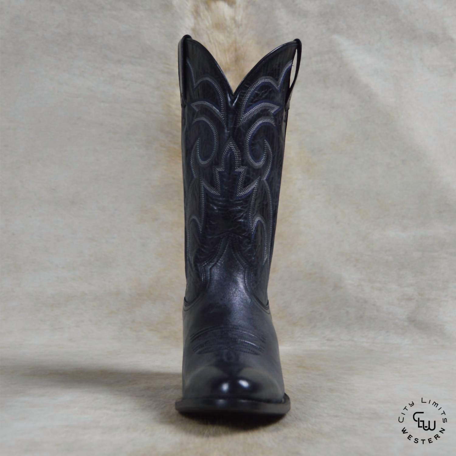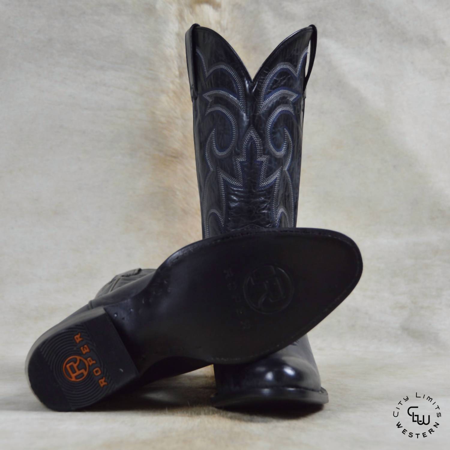 Introducing the Men's Parker R-toe Boot, perfect for the modern cowboy seeking both style and function. With a marbled black vamp and 13" shaft, these boots boast an all-leather lining and a robust leather cowboy heel. The design includes a removable REST insole and a ¾ welt sole with nails and lemonwood pegs. Crafted from high-quality leather, these boots are ideal for fall and feature an almond toe and block heel for a classic western silhouette.