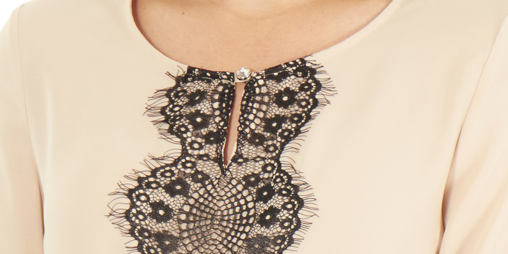 100% poliéster | manga 3/4 | gola redonda | bainha peplum | acabamento em renda