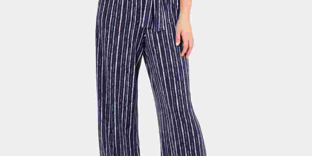 Macacão listrado com cinto feminino NY Collection, azul, tamanho pequeno, médio