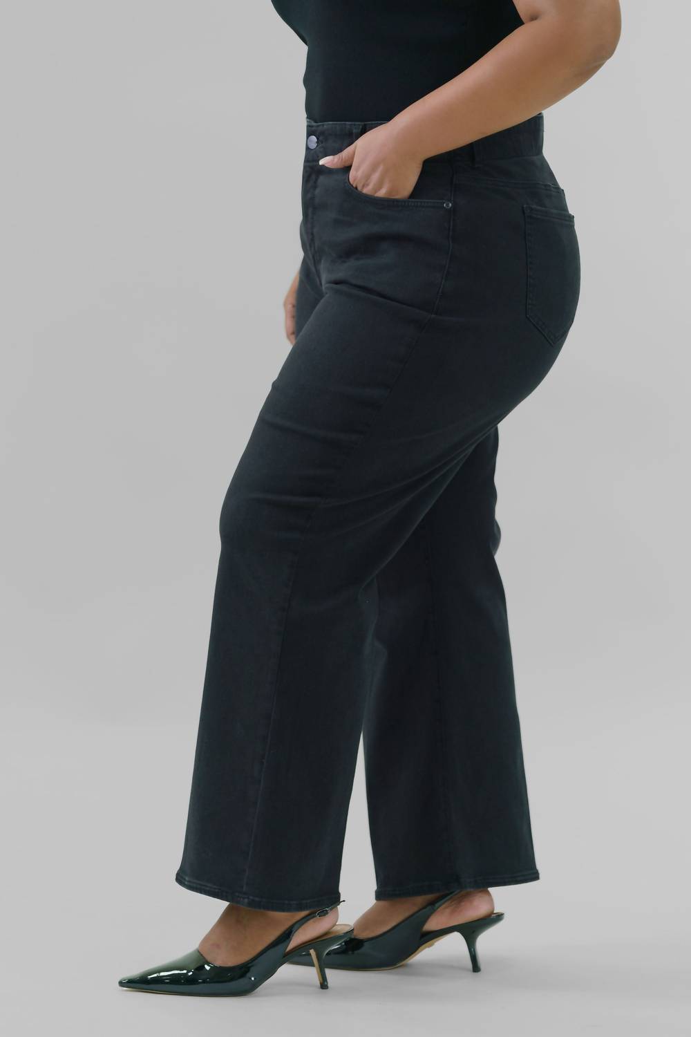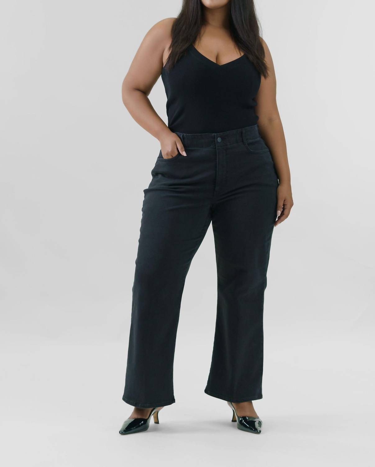 Discover the Waist Match High Rise Major Wide Leg Jeans by NYDJ, a perfect blend of style and comfort in classic black. These jeans feature a high-rise waist and relaxed fit, with a unique satin elastic waistband that molds to your shape. Crafted from a cotton blend, they provide a slimming silhouette with a wide leg cut and a proprietary Lift Tuck Technology for a smoother fit. Closure is secured with a button and zip fly, and these jeans come with five-pocket styling, suitable for machine wash and line dry.