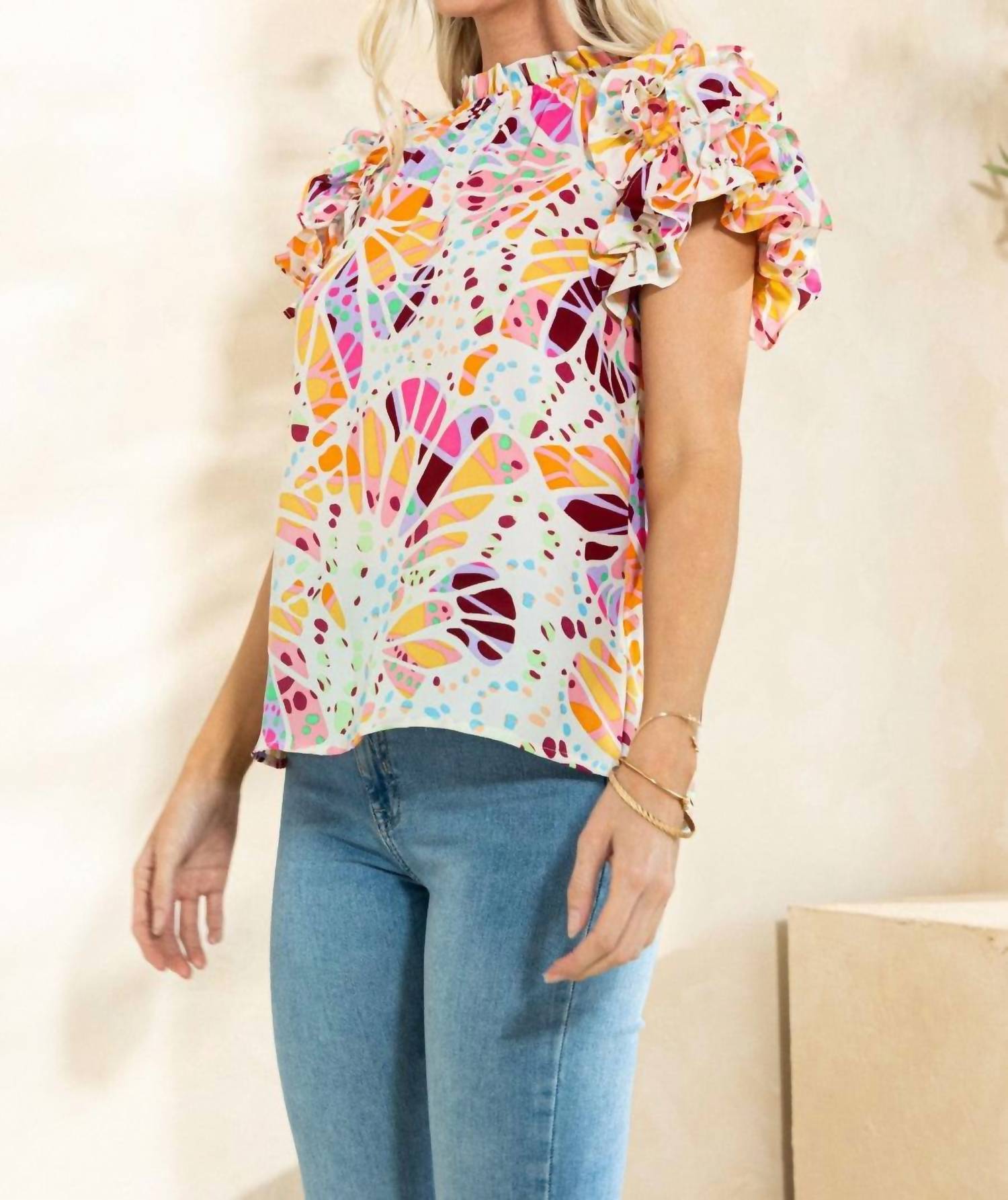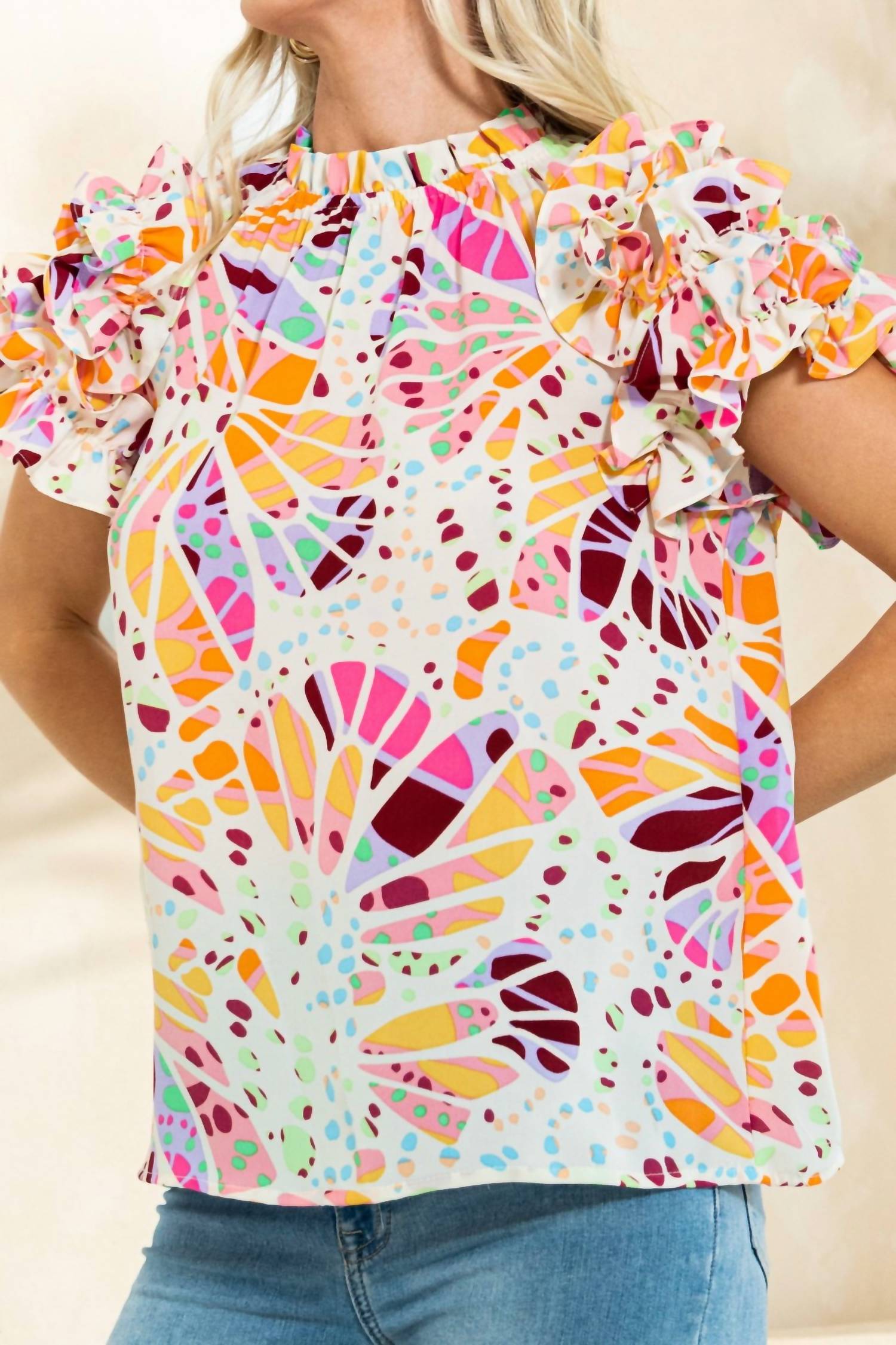Embrace effortless style with the Nothing Left To Say Blouse by Oddi, a vibrant multi-color top perfect for vacation vibes. This patterned blouse showcases short ruffle sleeves, a charming cowl neck, and a relaxed fit. Crafted from 100% polyester, it features a button and keyhole back closure for added flair. A playful and carefree addition to your wardrobe, designed for those leisurely days.